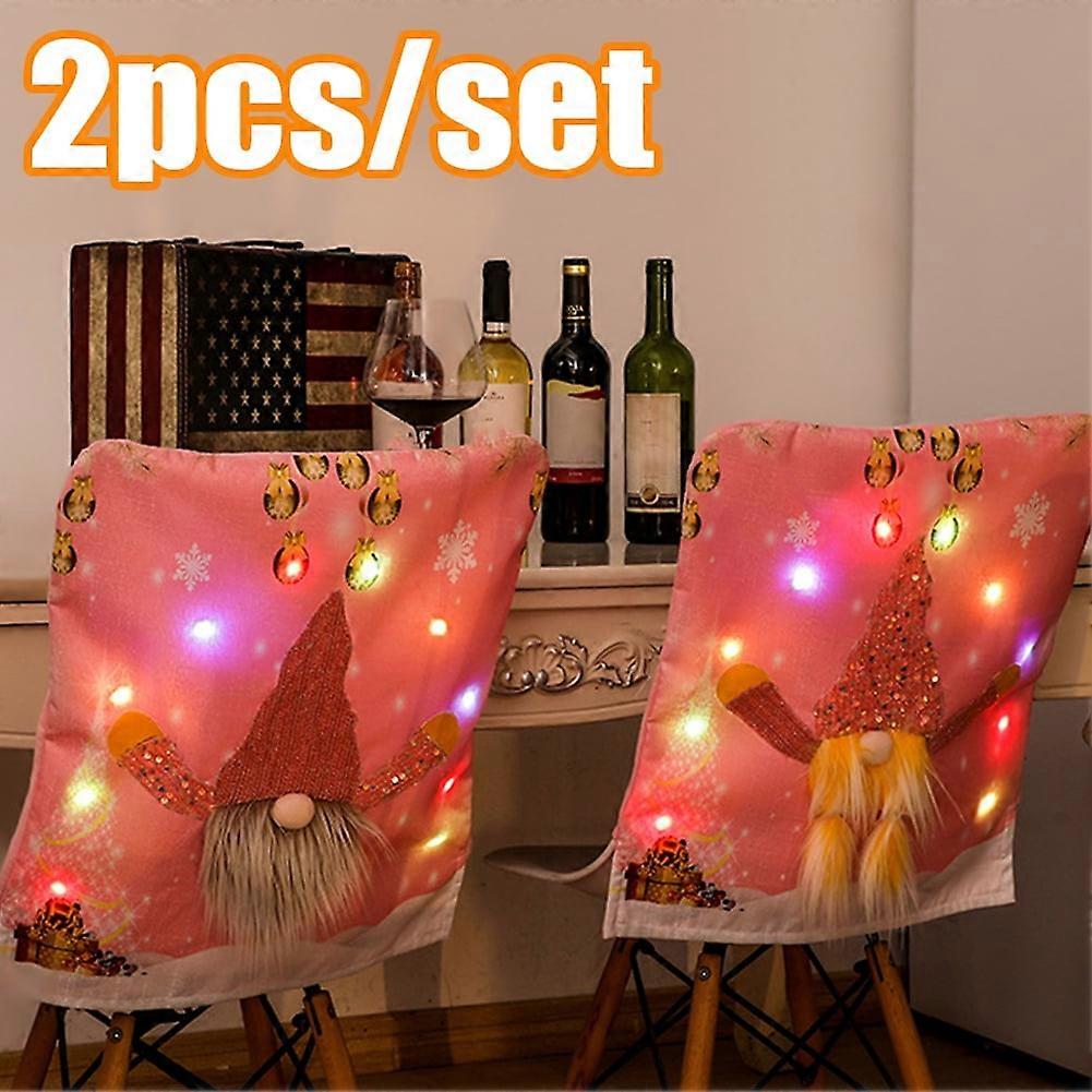 Vnanda 2Packs Christmas Chair Covers with LED Lights, Pink Gnome, Dining Chair Slipcovers for Xmas Party Decor