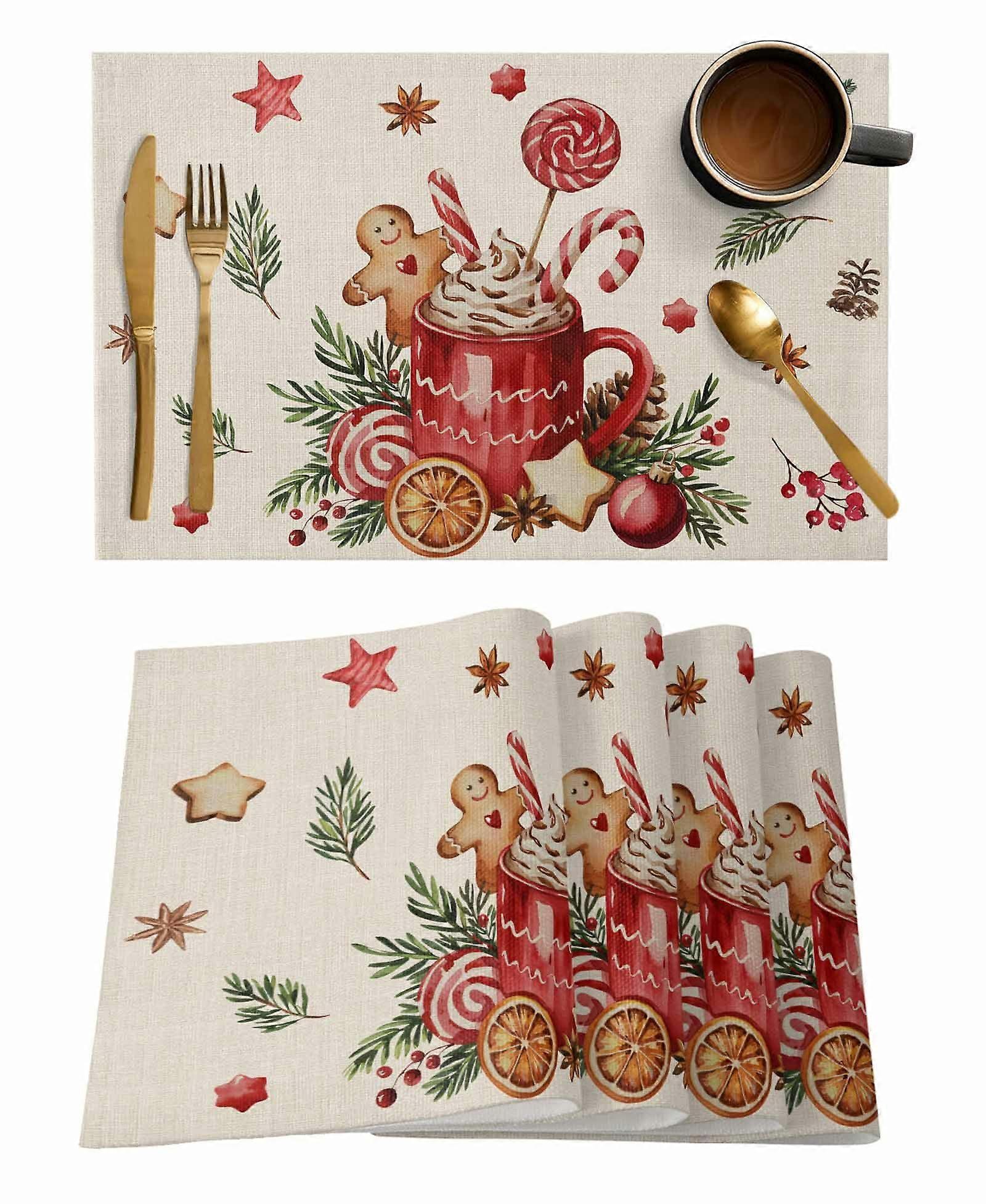 Christmas Coffee Gingerbread Man Placemats Set of 4 Candy Pine Branch Vintage Heat Insulation Washable Place Mats, Rustic Non-Slip Table Mats for