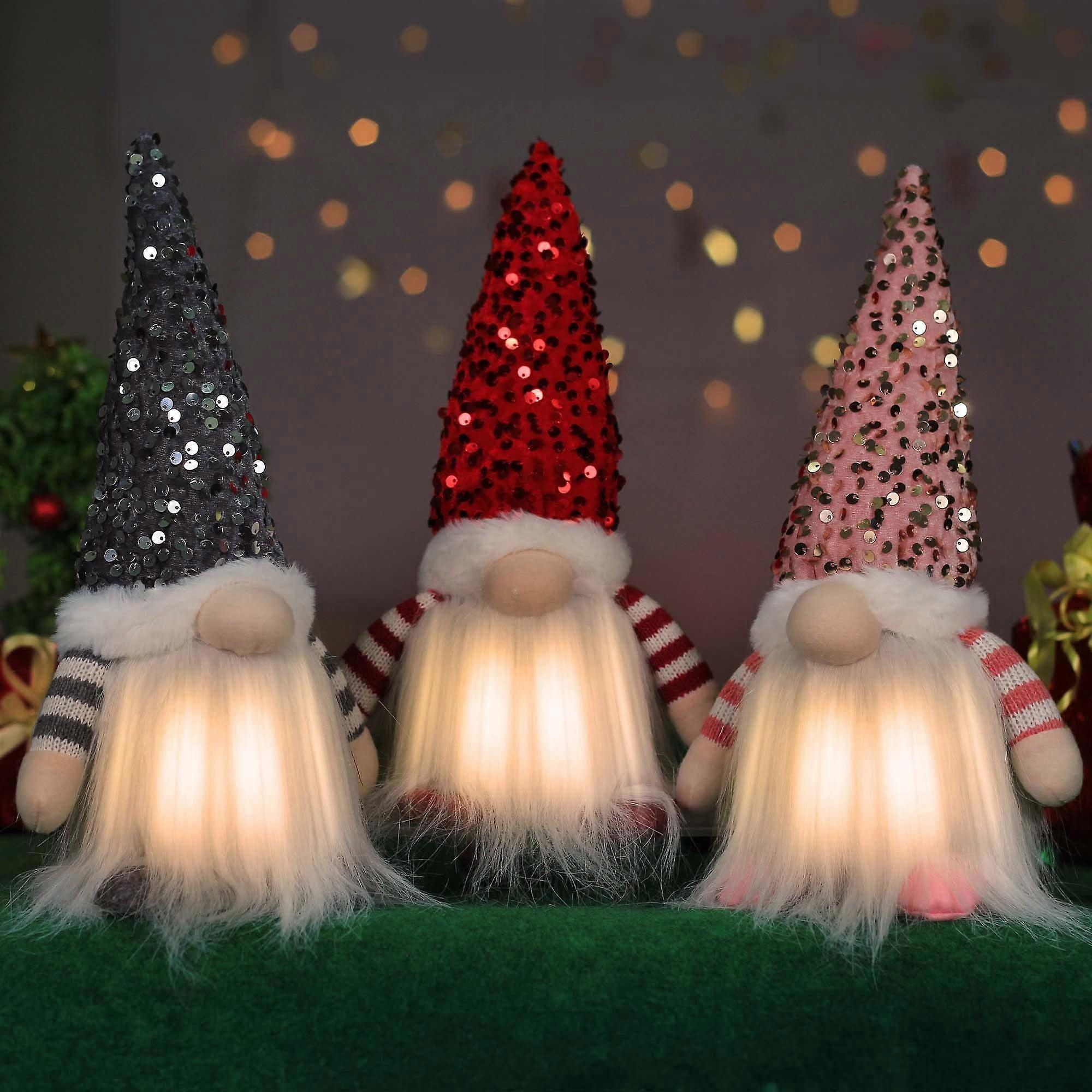 3PCS Christmas Gnome Decorations 12",Light Up Handmade Gnomes Plush Ornaments with Glitter Sequins Swedish Hat Leprechaun Dwarf,Holiday Table Decor &
