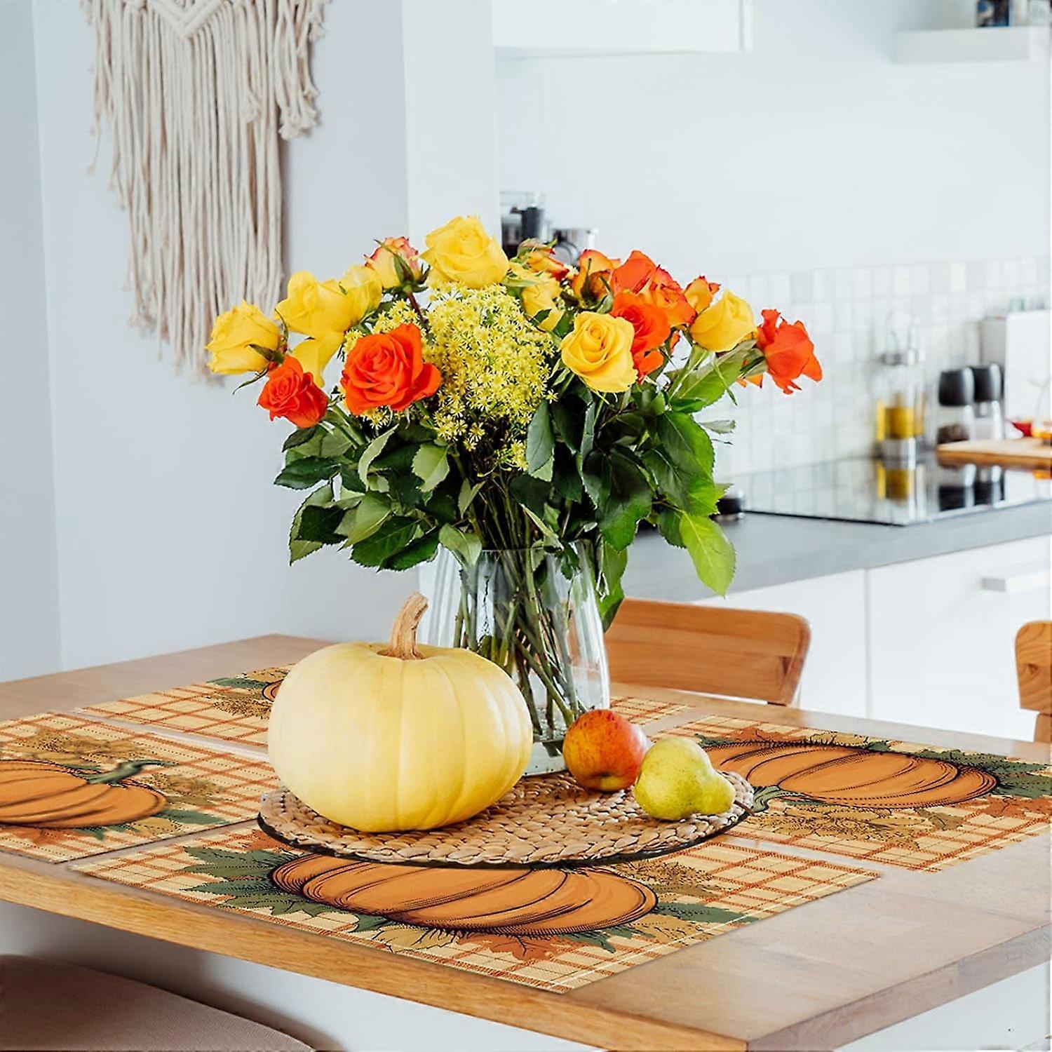 Orange Buffalo Plaid Pumpkin Fall Thanksgiving Placemats Set of 4, 12 x 18 Inch Leaf Holiday Rustic Vintage Farmhouse Place Mats Linen Dining Table