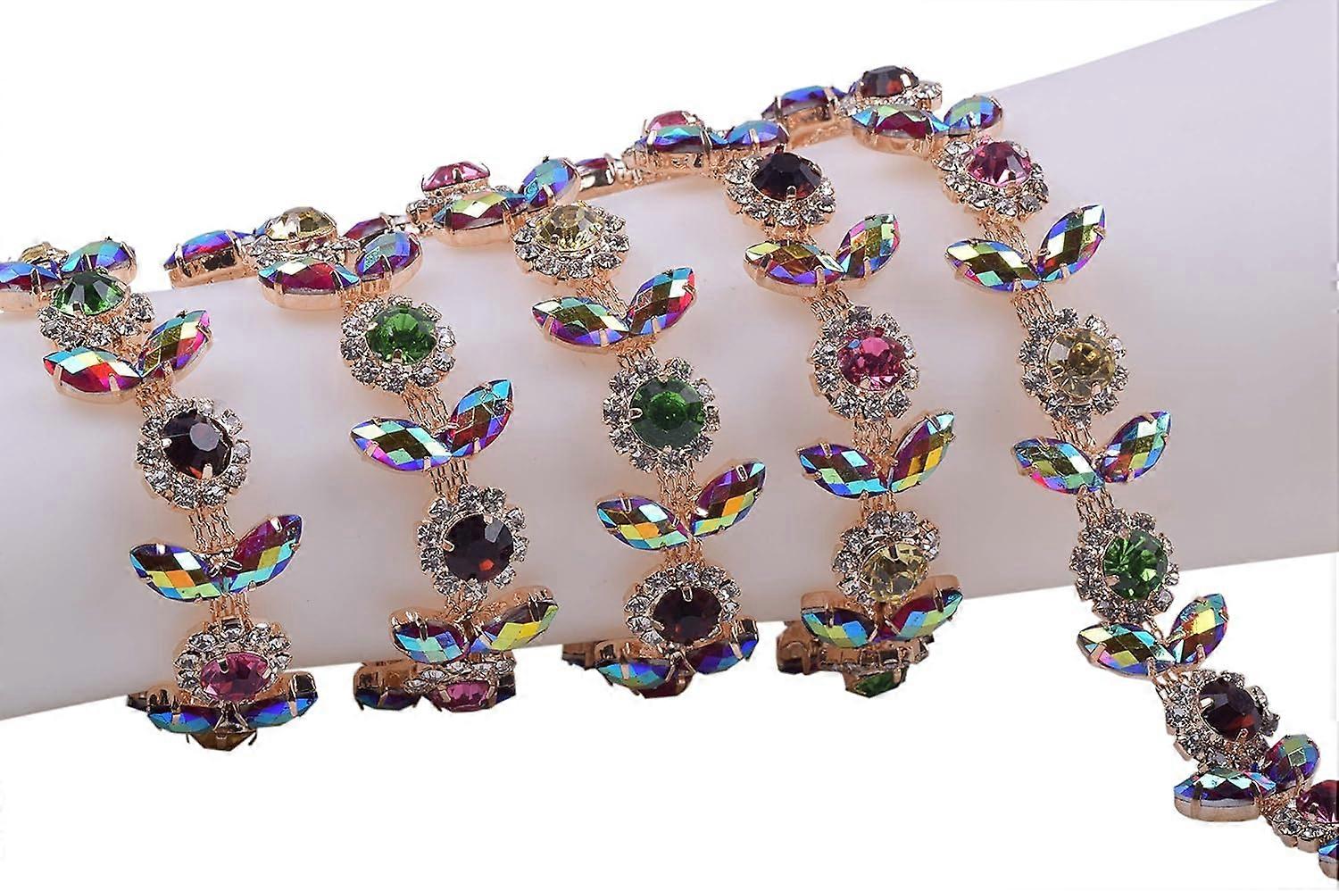 1 Yard Flower Shaped Full Diamond Crystal Rhinestone Chain in Golden Brass Base Prong Sew on Clothing and Bridal Bouquet Embellishments Rainbow