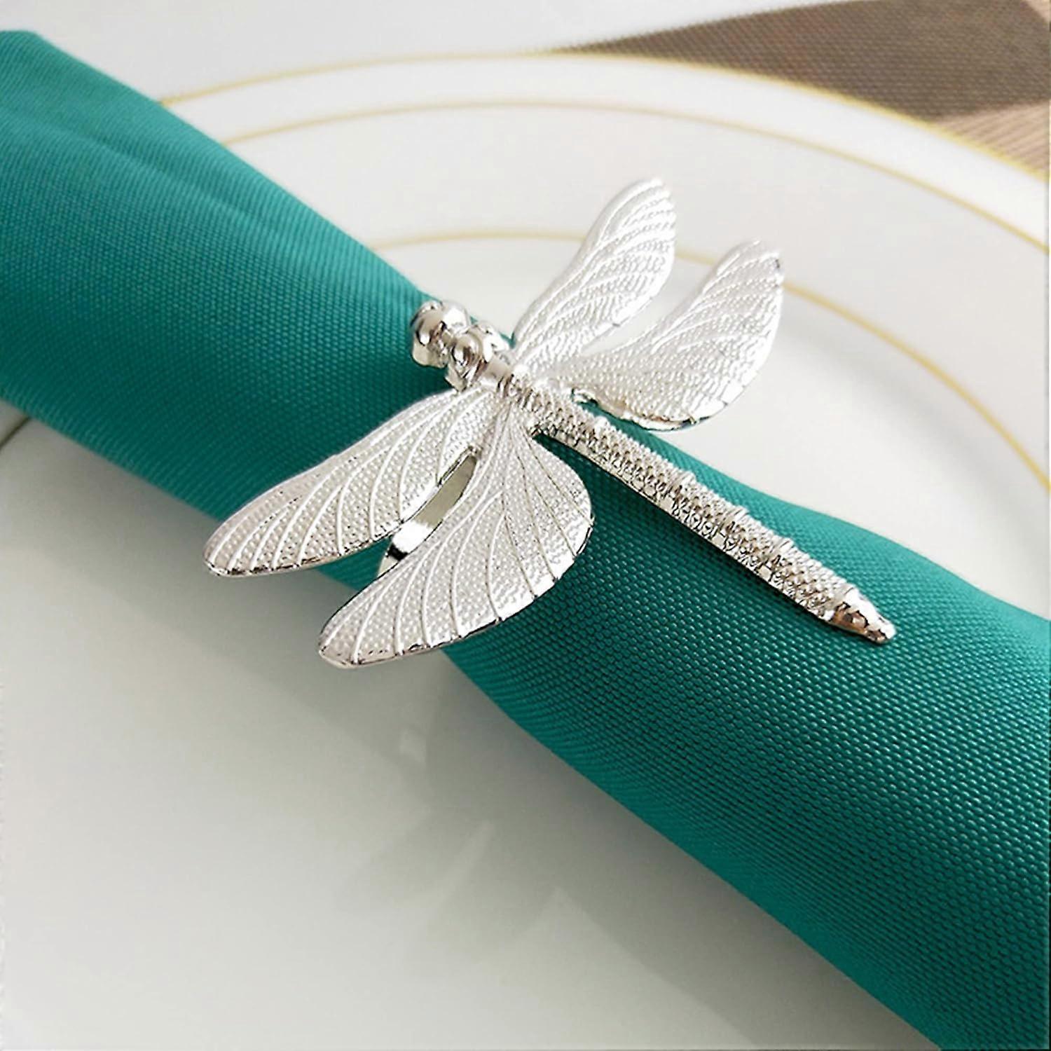 Silver Napkin Rings Set of 6 for Summer Wedding Fathers Day Metal Dragonfly Napkin Holders for Table Linens, Dining Kitchen Coffee Everyday Use