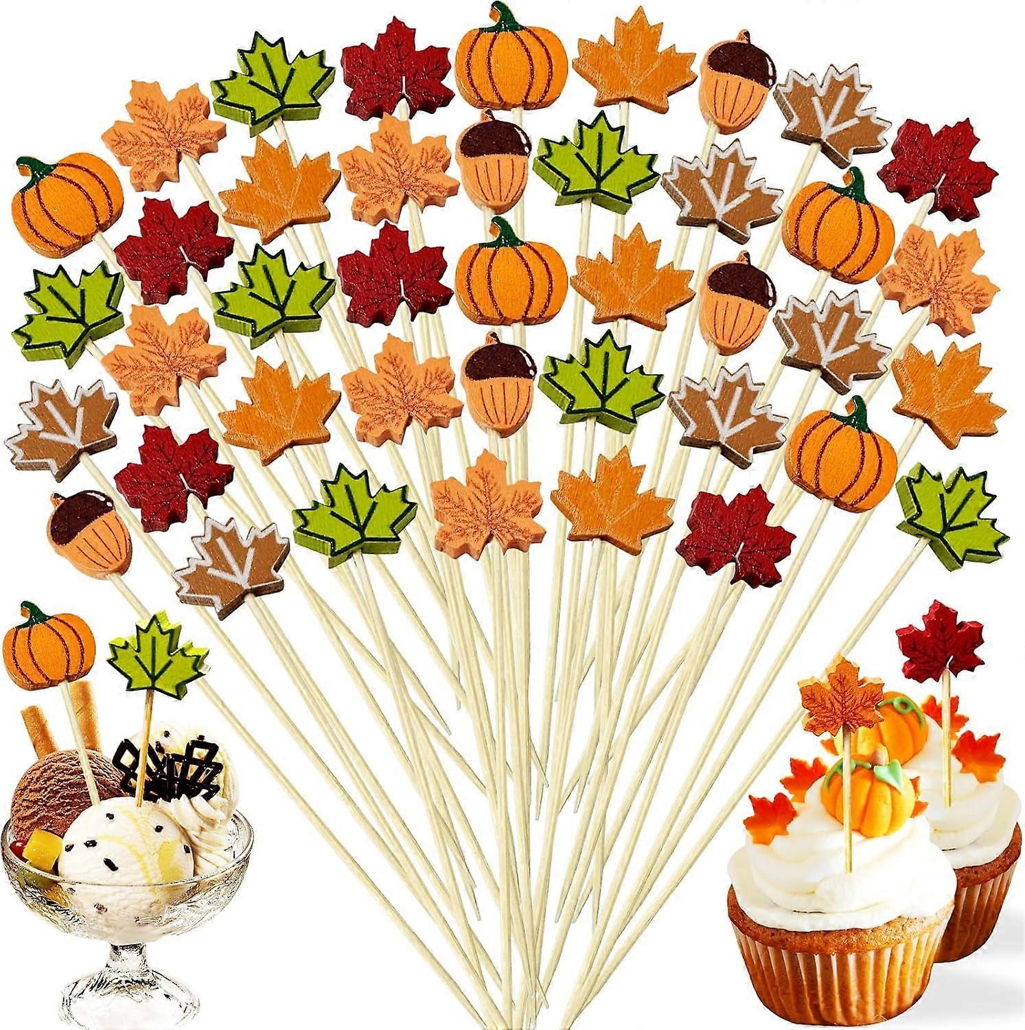 300 Pcs Fall Cocktail Picks 4.7 Inch Maple Leaves Pumpkins Acorns Decorative Toothpicks Fall Autumn Bamboo Picks Food Appetizer Fruit Sticks for