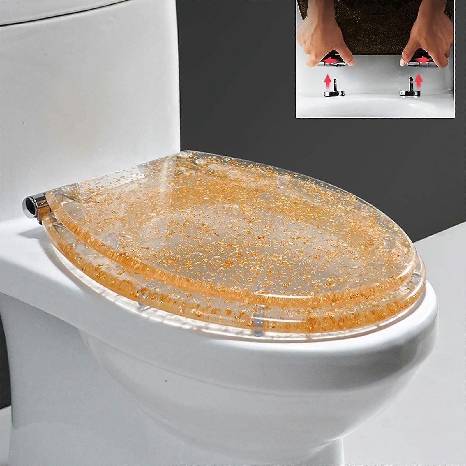 Glitter Round Toilet Seat Soft Close Resin With Quick Release, Fixing, Adjustable Hinges, Gold Foil Finish
