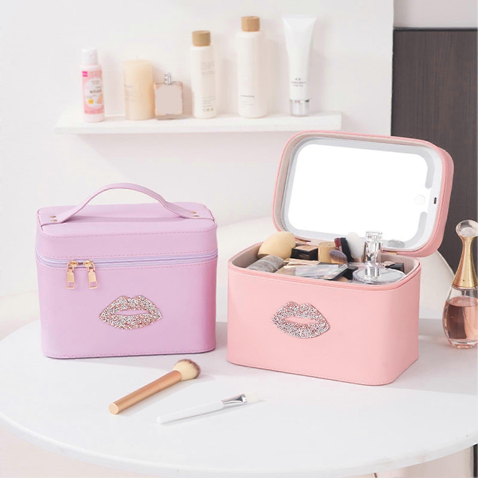 SUSUchens Travel Makeup Bag with LED Lighted Mirror Large Capacity Zipper Closure Handle Design Portable Cosmetic Makeup Organizer Bag Pink