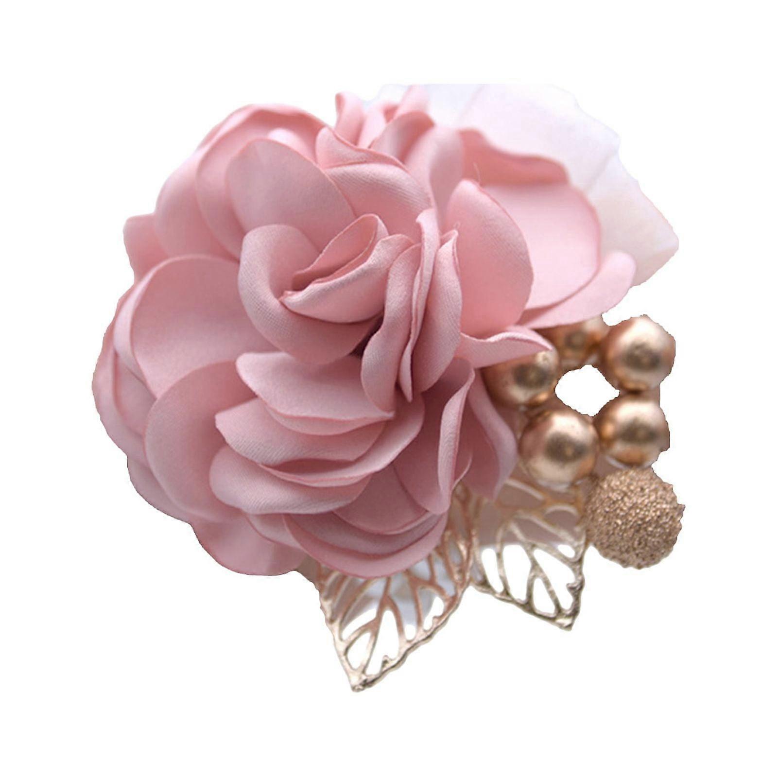SUSUchens Bridal Rose Wrist Corsage with Realistic Artificial Flowers, Hollow Leaves, Faux Pearls & Golden Ball, Elegant Pink Wedding Bridesmaid