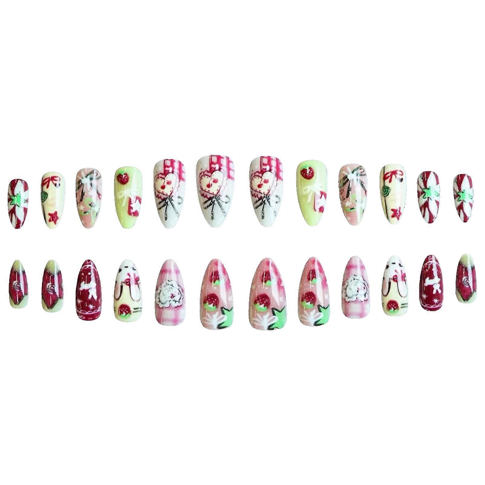 24Pcs Almond Shape Press on Nails with Strawberry Bunny Design Cute Artificial