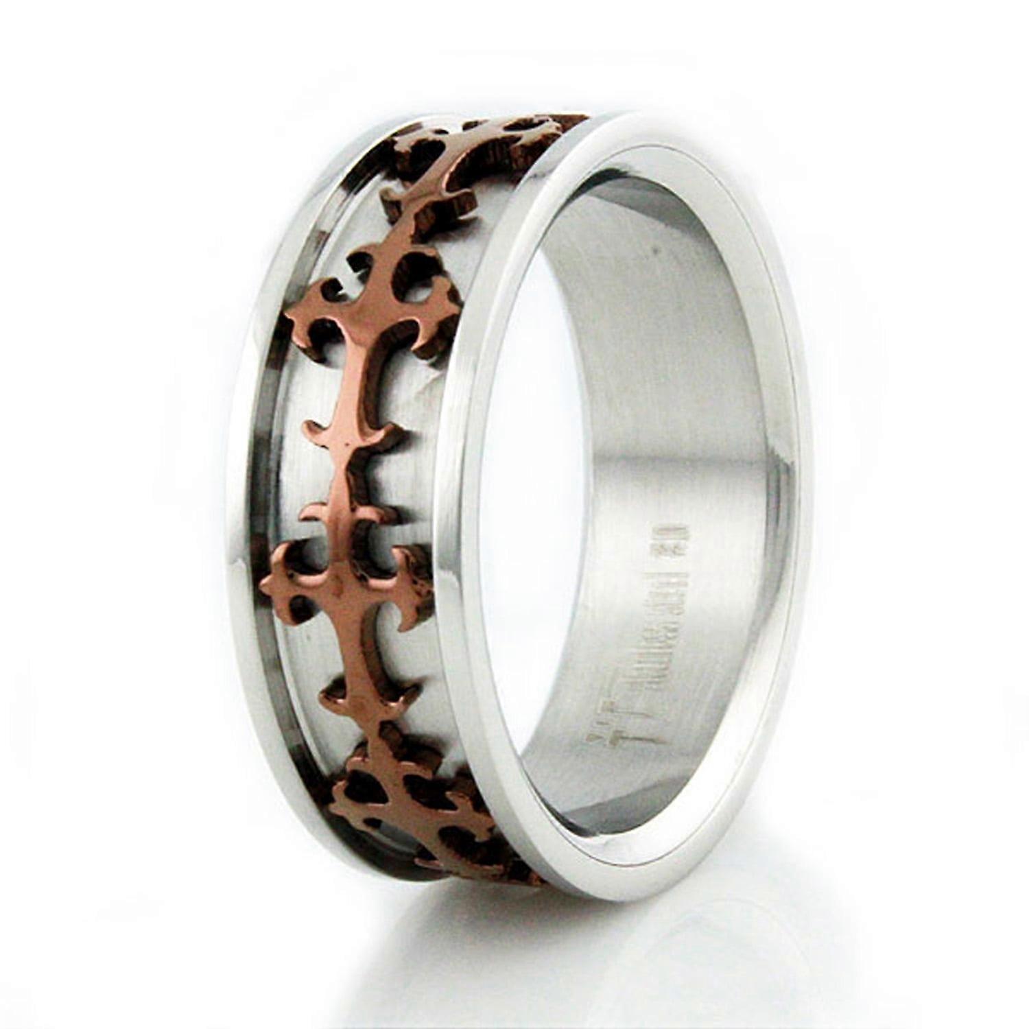 The Tioneer Two-Tone Stainless Steel Bronze Celtic Cross Wedding CZ Band Ring features a striking design combining bronze and stainless steel. Adorned with a Celtic cross motif and cubic zirconia accents, this ring symbolizes unity and timeless style. Its robust stainless steel construction ensures durability, while the intricate bronze details add elegance. Perfect for weddings or daily wear, this unique ring blends tradition and modernity, making it a meaningful accessory for any occasion. Surgical Grade Stainless Steel Two-Tone Bronze Celtic Cross Wedding Band Design Width: 8 mm Polished Finish Traditional Fit Wear