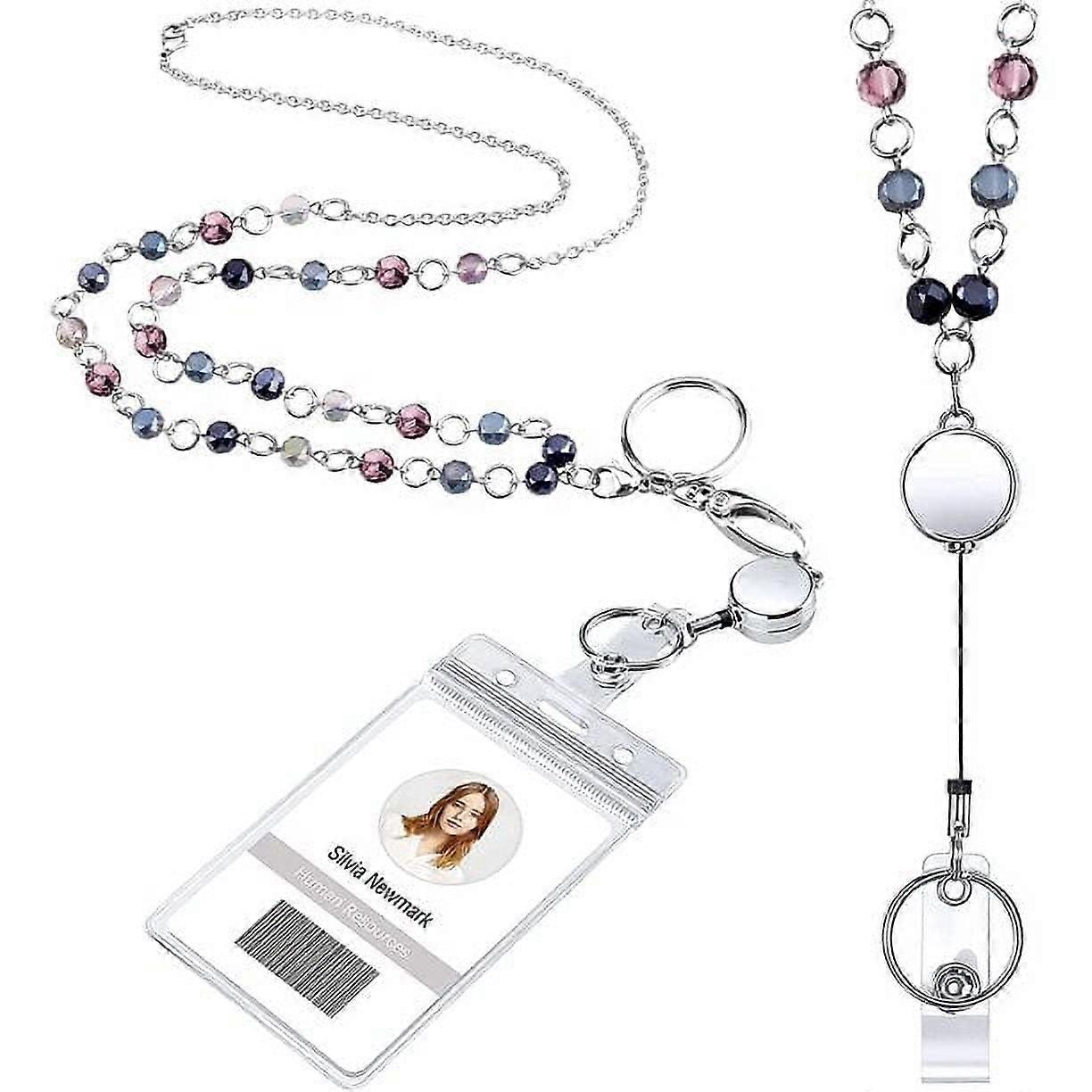 Retractable Badge Reel Lanyard with ID Holder, Beaded Stainless Steel Chain Necklace & Clear Waterproof Card Holder (B)