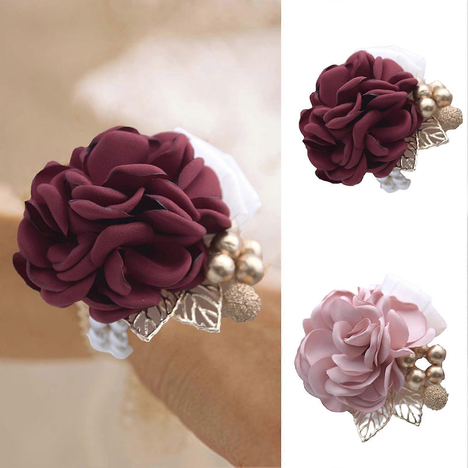 SUSUchens Bridal Rose Wrist Corsage with Realistic Artificial Flowers, Hollow Leaves, Faux Pearls & Golden Ball, Elegant Wedding Bridesmaid