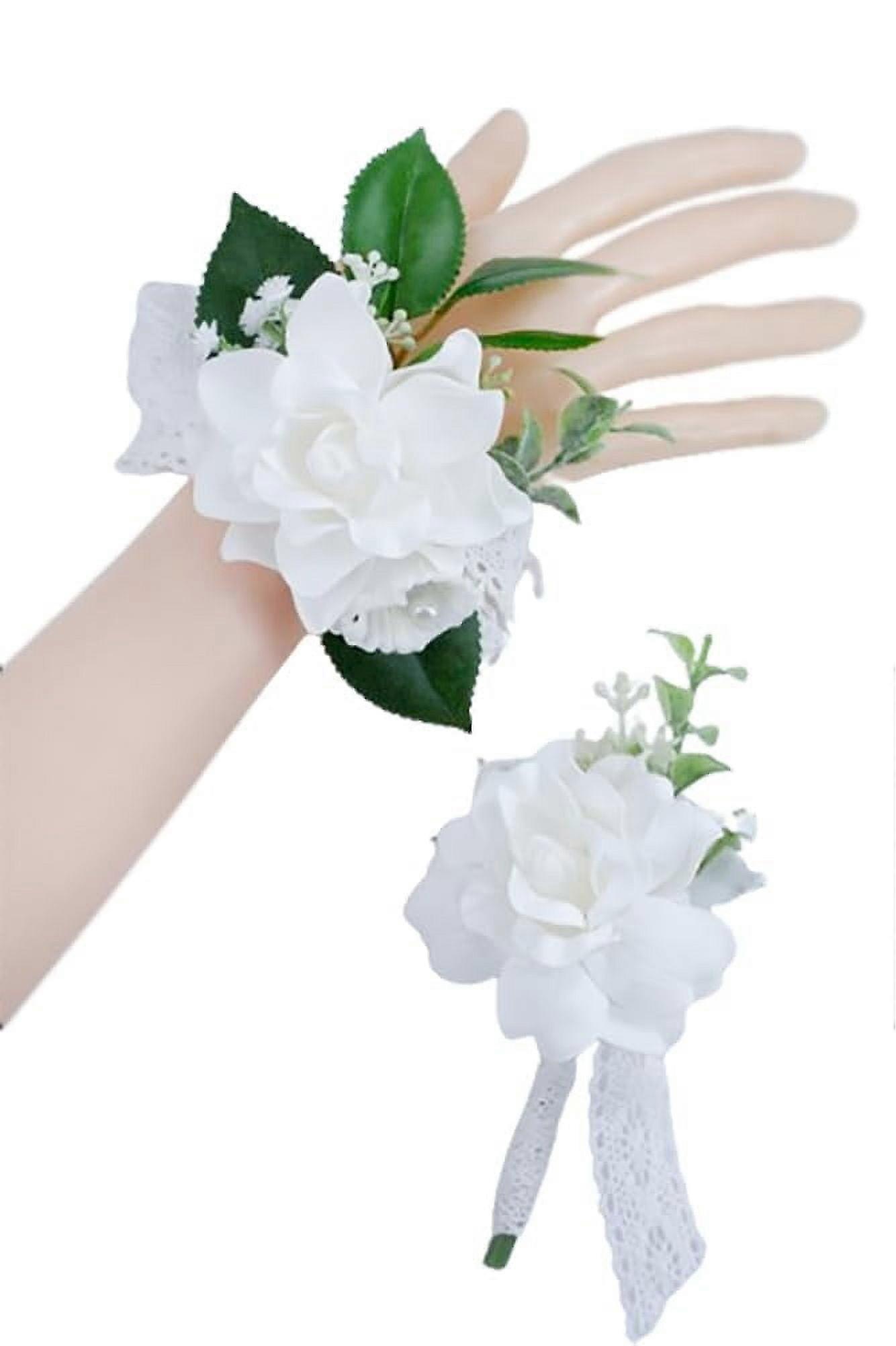 White Wrist Corsage & Boutonniere Set for Wedding, Prom, Homecoming - Artificial Rose Flowers Compatible with Bridal Party Decor