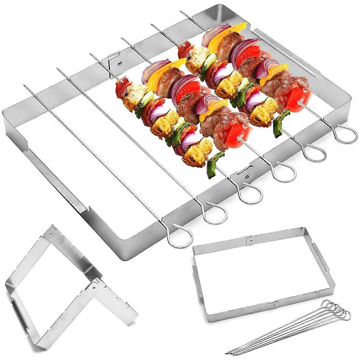 BBQ Skewer Rack with 6 Skewers, Stainless Steel Foldable Rotating Grill Rack for Shish Kebab Grilling