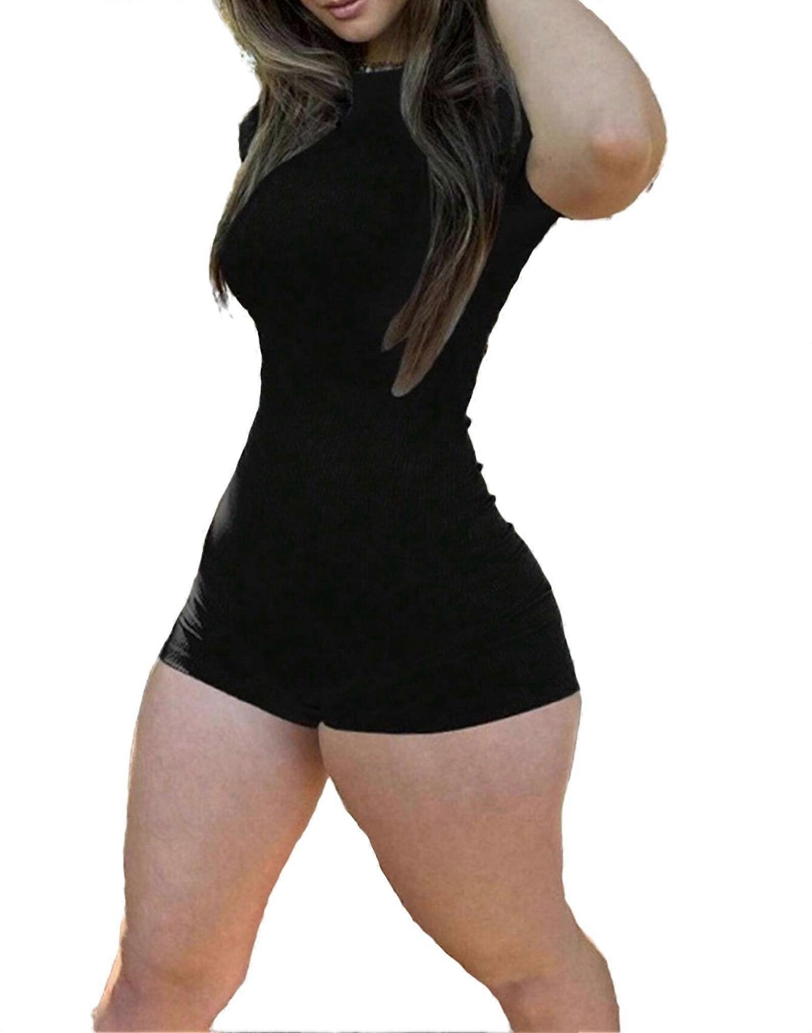 Women Unitards Black Colour Plain Round Neck Short Sleeve Casual