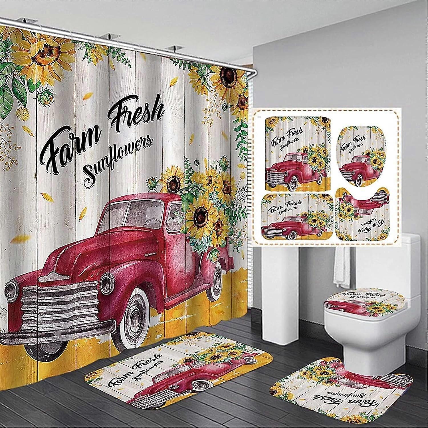 4Pcs Farmhouse Sunflower Shower Curtain Set with Non-Slip Rugs, Toilet Cover & 12 Hooks, 70.8×70.8, Compatible with Rustic Bathroom Decor