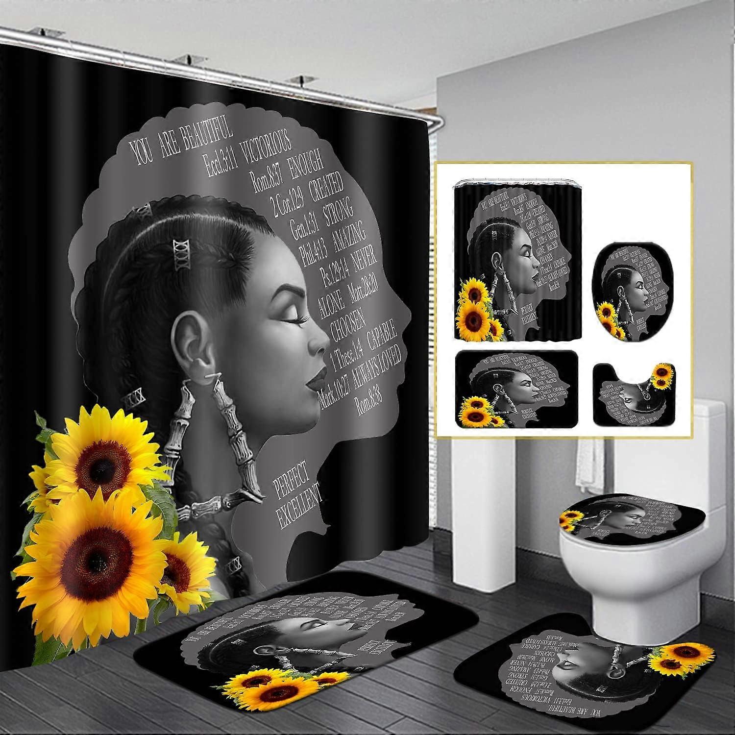 4 Pcs Sunflower Black Queen Bathroom Set, African American Queen Shower Curtain with Hooks, Afro Floral Girl Rugs & Toilet Cover, compatible with