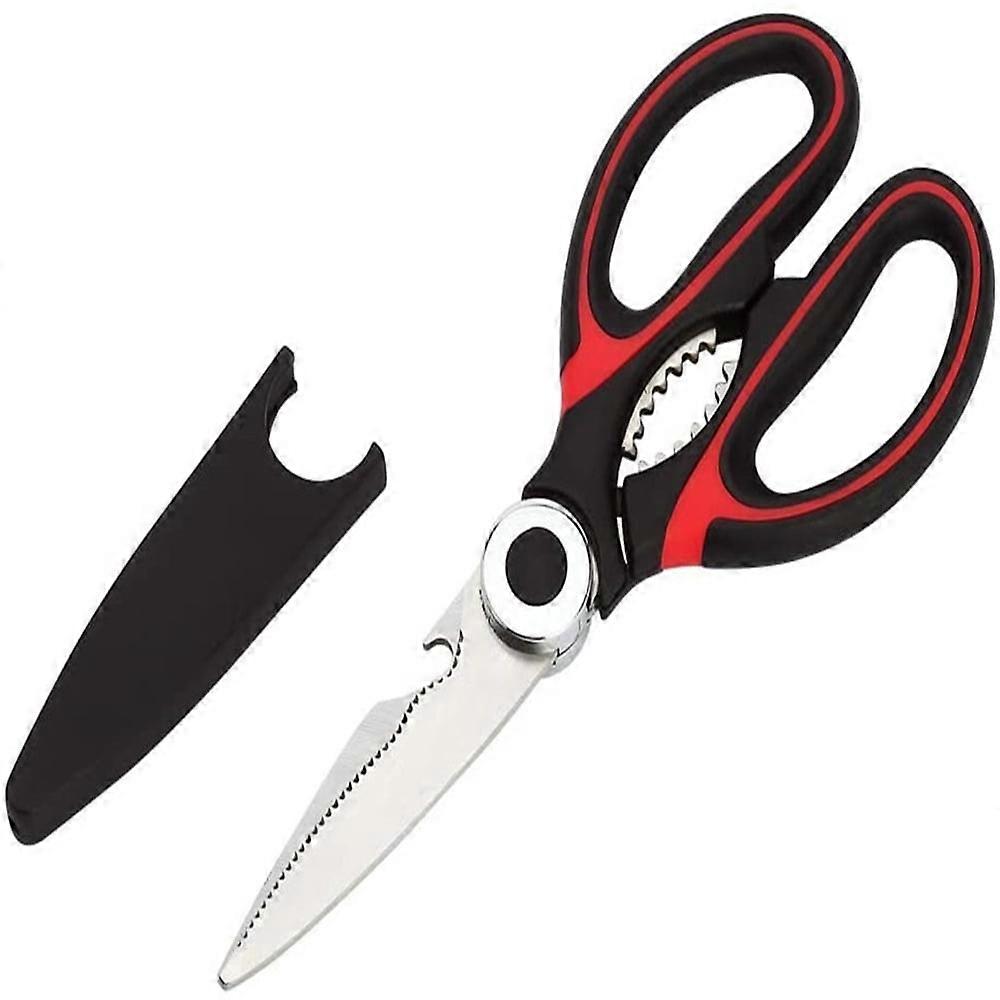 Product Description Material: corrosion-resistant stainless stee FEATURES AND BENEFITS: 1. Multi-function food scissors, it can be used as kitchen gadgets, christmas crackers, poultry shears,bottle opener, chopper, nut cracker, gardening scissors.Professional design for your luxury kitchen, restaurant and office. Good for camping, BBQ, and out door activity. Good helper in the kitchen. 2. Non-Slip Ergonomic Handle, well shaped grip to the form of your hand makes it very comfortable to hold. 3. Plastic blade guard protects you and the children from accidental cuts. 4. Non-slip ABS material prevents from accidental slides especially in wet conditions. ATTENTION: Please keep out of reach of children. compatible with Sharp blade, please use carefully. Wipe the blade with a clean dry cloth after using (Dry thoroughly before storage). 【High quality blades】: Kitchen scissors heavy duty blades are made of food grade nitrided stainless steel plate, which is stronger and more durable than ordinary stainless steel plate. Micro-fine serrated design easily cuts cardboard, twine, meat, vegetables, chicken, poultry, fish, herbs, seafood, grill, pasta, pizza, food bags, etc. Powerful and reliable. 【Removable and easy to clean】: The removable ultra compatible with sharp heavy duty kitchen scissors easily clean food particles left on the blades, which is the key to your peace of mind when preparing food. Dishwasher safe. 【Great companion when cooking】: Separate cooked foods for healthier eating. Blue, red (cooked food) No knives and cutting boards needed,1-Pack kitchen scissors will make any meal preparation faster, easier and safer 【Comfortable and Safe】: TPR soft handle design, save time and effort, can reduce the pressure of the hand and wrist. Suitable for left or right handed use. Equipped with removable blade cover to protect your scissors and hands. 【Multifunctional kitchen scissors】: Super compatible with sharp multi-purpose scissors for kitchen, home and outdoor use as food scissors, meat scissors, cooking scissors, kitchen scissors, poultry scissors, vegetable scissors, herb scissors, utility scissors.