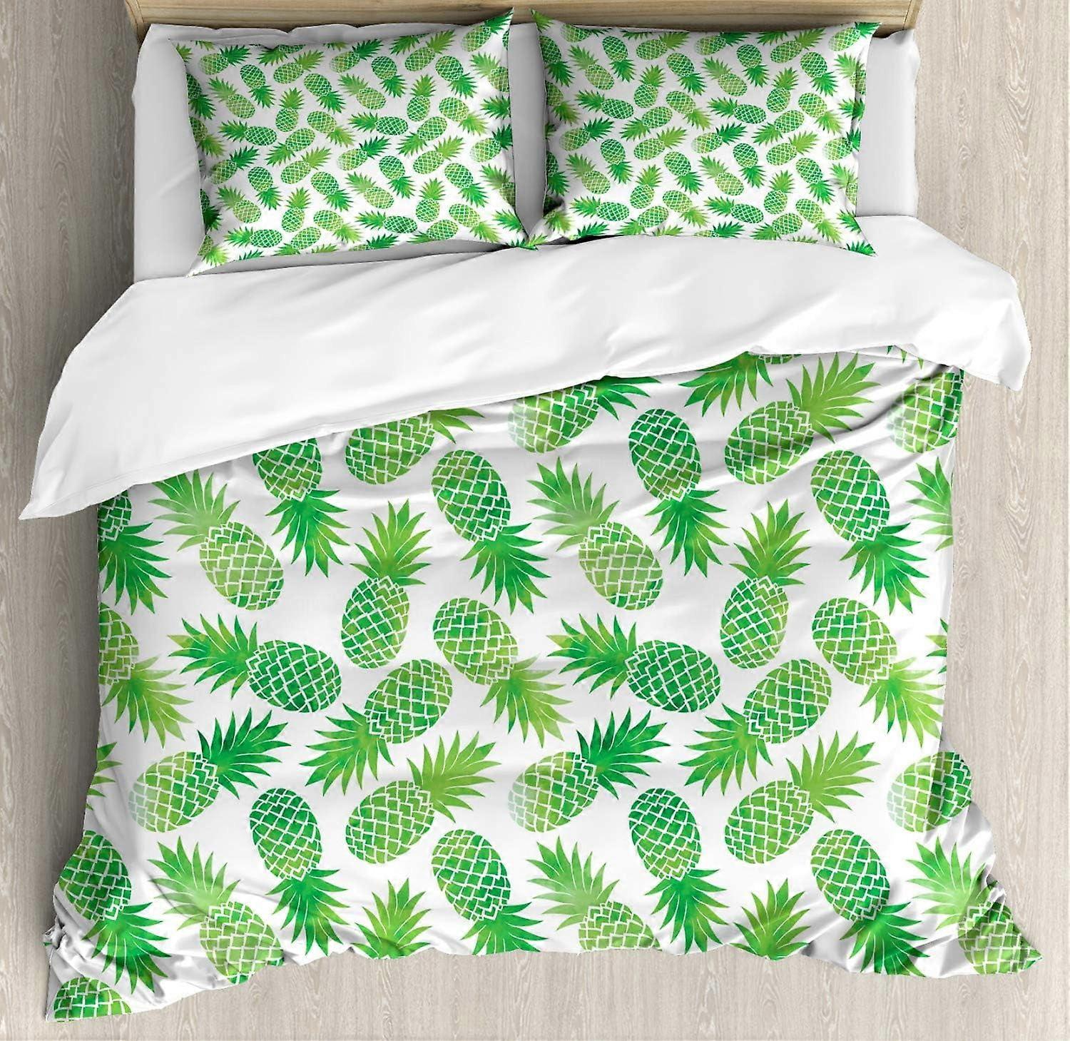 Pineapple Duvet Cover Set, Ombre Watercolor Pineapples on Plain Background, 3-Piece Green & White Bedding Set with 2 Pillowcases