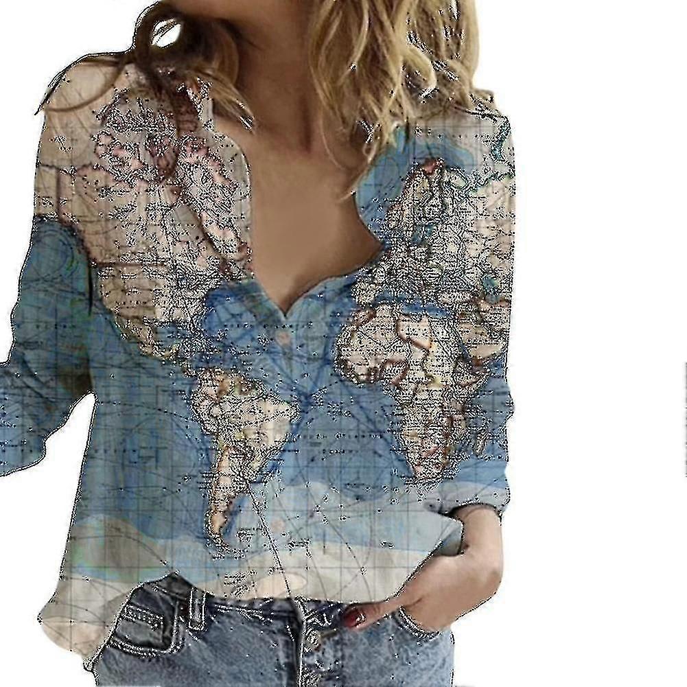 World Map Print Shirt Lady Long Sleeve Blouse Summer Daily Causal Tops Single-breasted Turn-down Collar Geography PatternZZ41