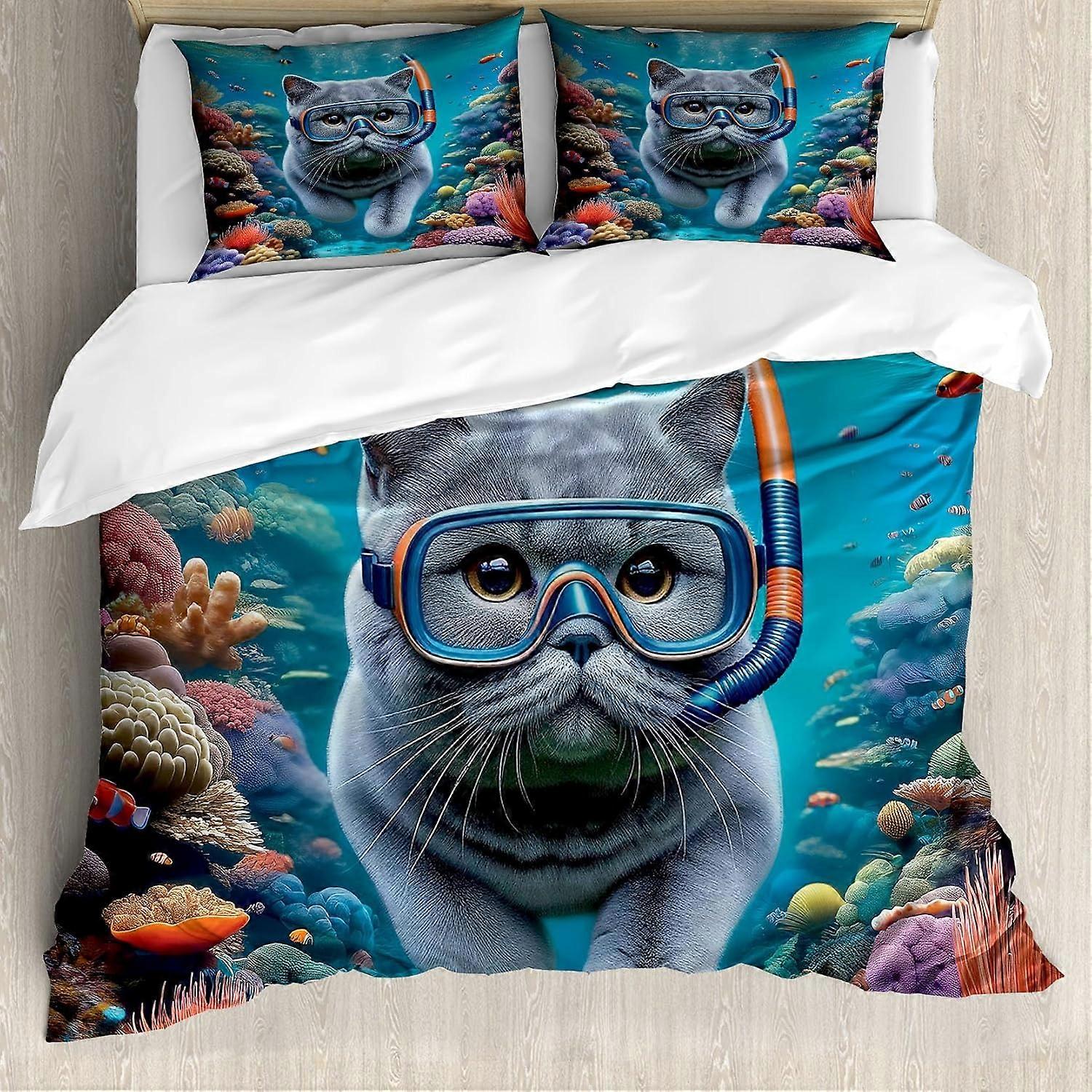 Nautical Duvet Cover Set, Funny Surreal Grey Cat Diving in Ocean Reef, 3-Piece Bedding with 2 Pillowcases, Turquoise Multicolor