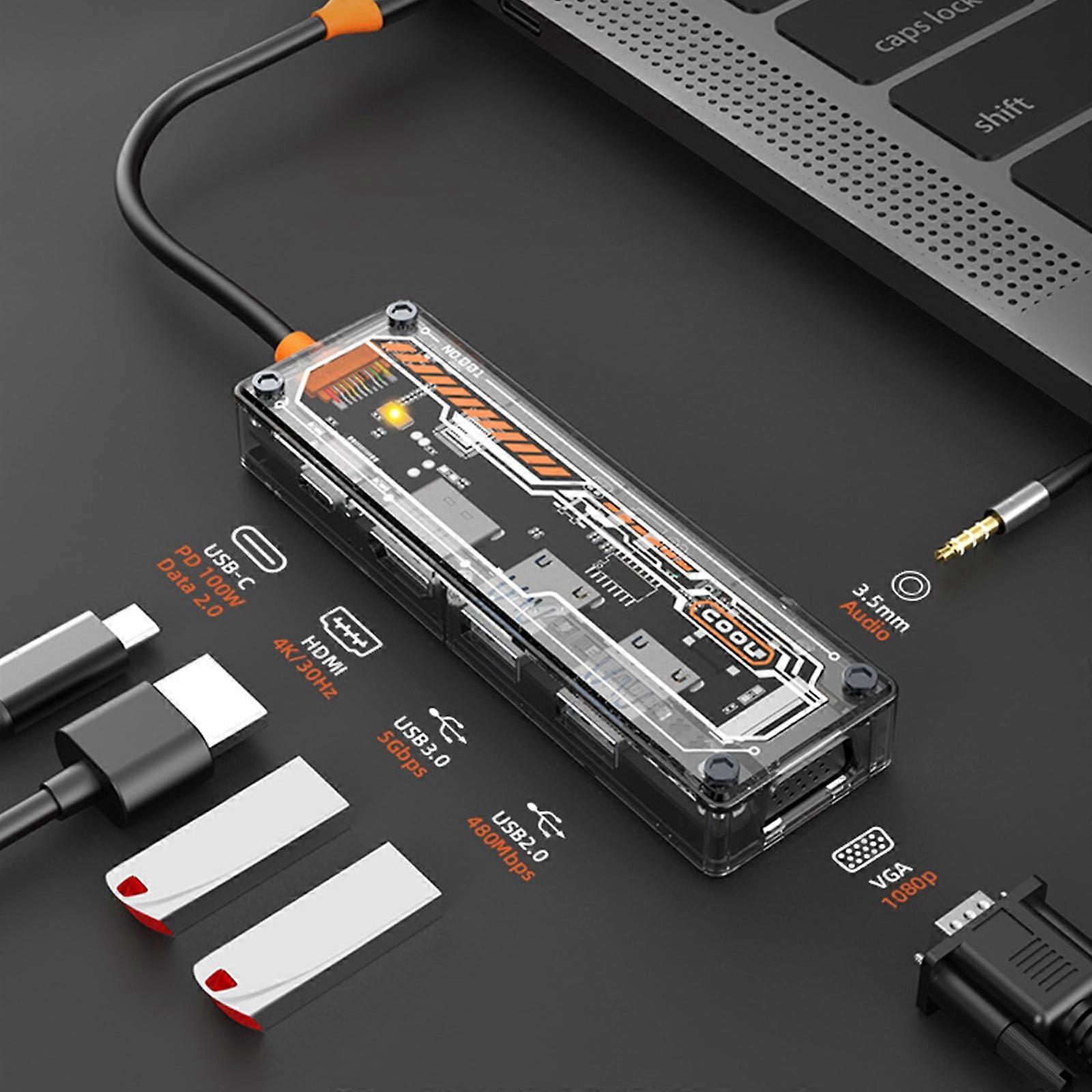 PRETXORVE Type C Hub Docking Station, USB3.0 Hub w/ PD3.0 100W Fast Charge, HDMI 4K30Hz, VGA, 3.5mm Audio