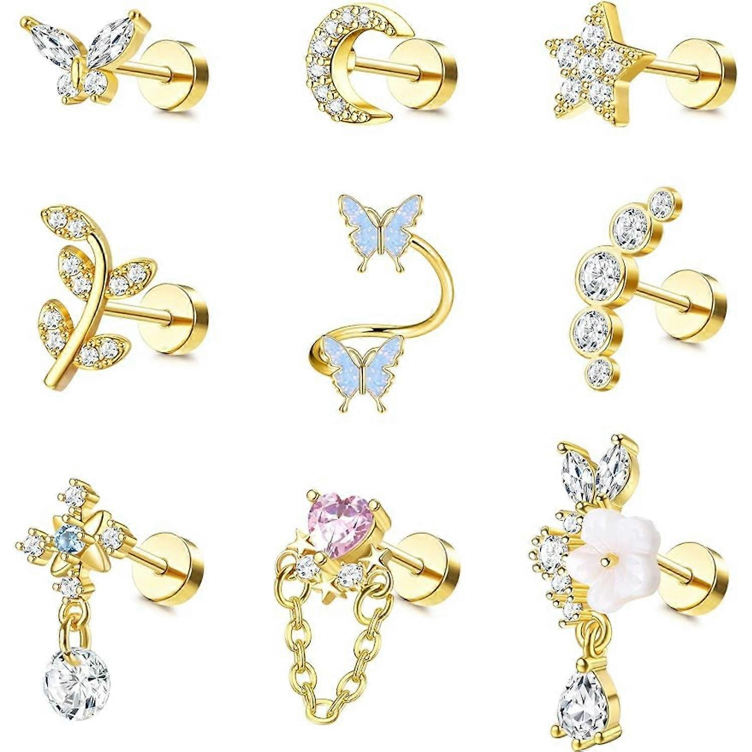【Piercing Earrings Pack】One order you will get 9Pcs stainless steel stud earrings in variety styles. There are CZ cartilage stud earrings, star moon stud earrings, butterfly earrings,etc. Small & sophisticated set of flat back stud earrings that you can wear to any occasion, layered in a variety of styles or worn on their own. 【Hypoallergenic Earrings】Made of the high quality stainless steel and AAA+ CZ, hypoallergenic, does not irritate the skin, improved electroplating process, will not turn green, high polished and smooth surface comfortable to wear it. 【Earring Sets for Multiple Piercing】These flat back earrings can be used cartilage earrings,helix earrings,conch piercing jewelry,tragus piercing jewelry,lobe earrings,etc. 【Size】Gauge: 16G(1.2mm) pin thickness, Post Length: 6mm, flatback size: 5mm. Can be worn alone or in multiples, a good choice for people who have many ear piercings. 【Convenient for Sleeping】Flat back design and screw back design,allow you to sleep without removing the earrings.A best gift for for Birthday, Araduation, Anniversary Day and more. Tiny stud earrings set is suitable for women of all ages.