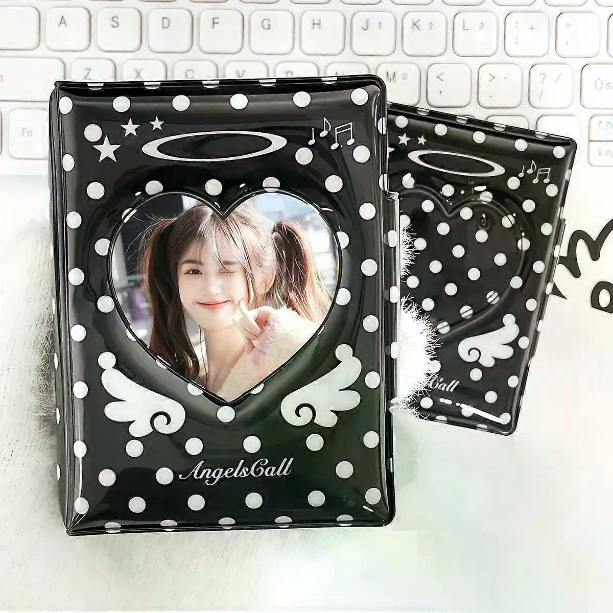 3in Photo Card Holder Cute Black Dot Angel Wings Photo Album Kpop Binder Can Be DIY Heart-Shaped Cut Out Cover Card Album Glossy Can Hold 32 Photo Car