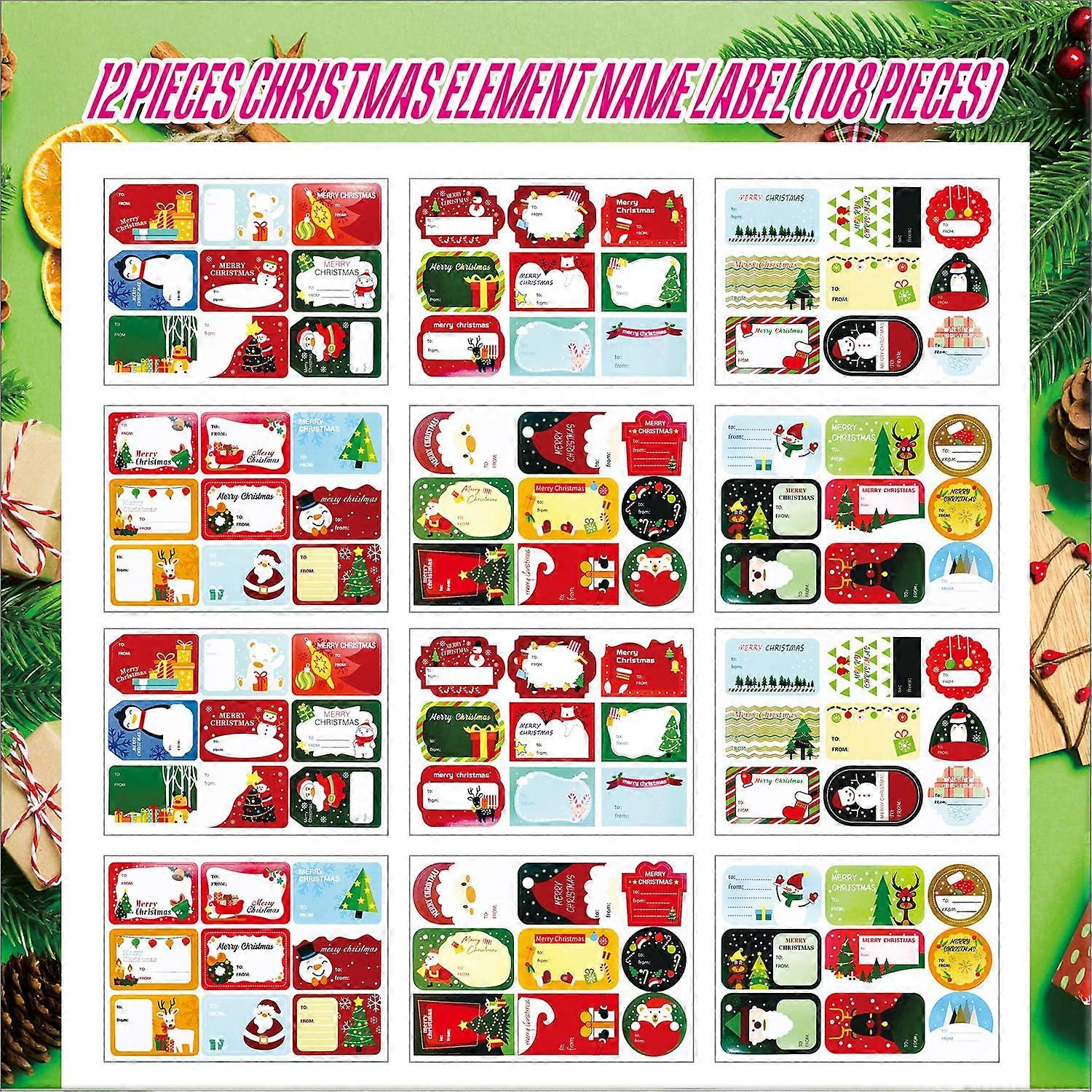 ZENGO Christmas Sealing Sticker Christmas Self Adhesive Gift Label Stickers 12 Pieces of 108 Pieces, Christmas Element Name Label