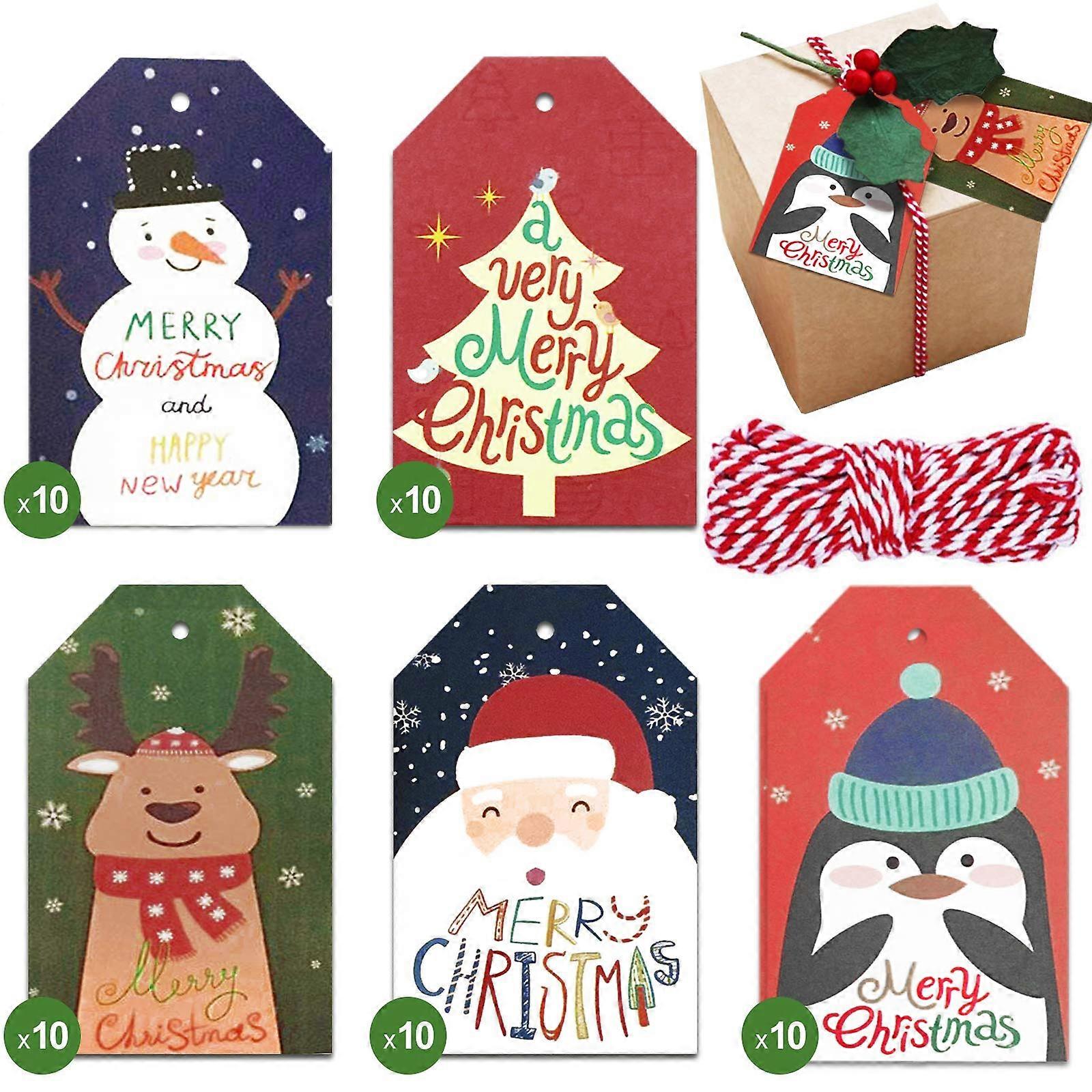 ZENGO Christmas Gift Tags with String, 50Pcs Xmas Kraft Paper Tags Card with Cotton Red White Twine for Gift Wrapping