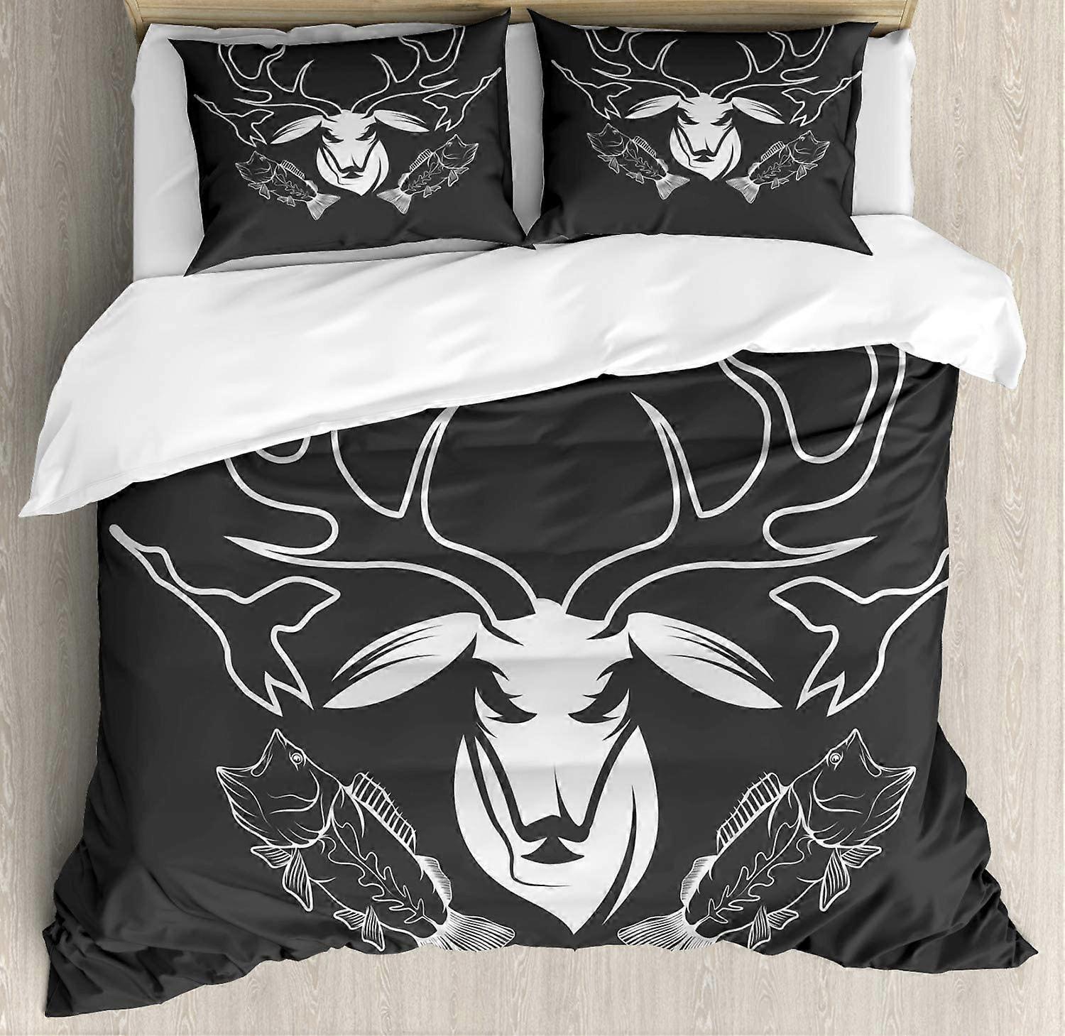 Deer Duvet Cover Set, Outline Deer & Fish Hunting Theme, Vintage Style 3-Piece Bedding with 2 Pillowcases, Grey White