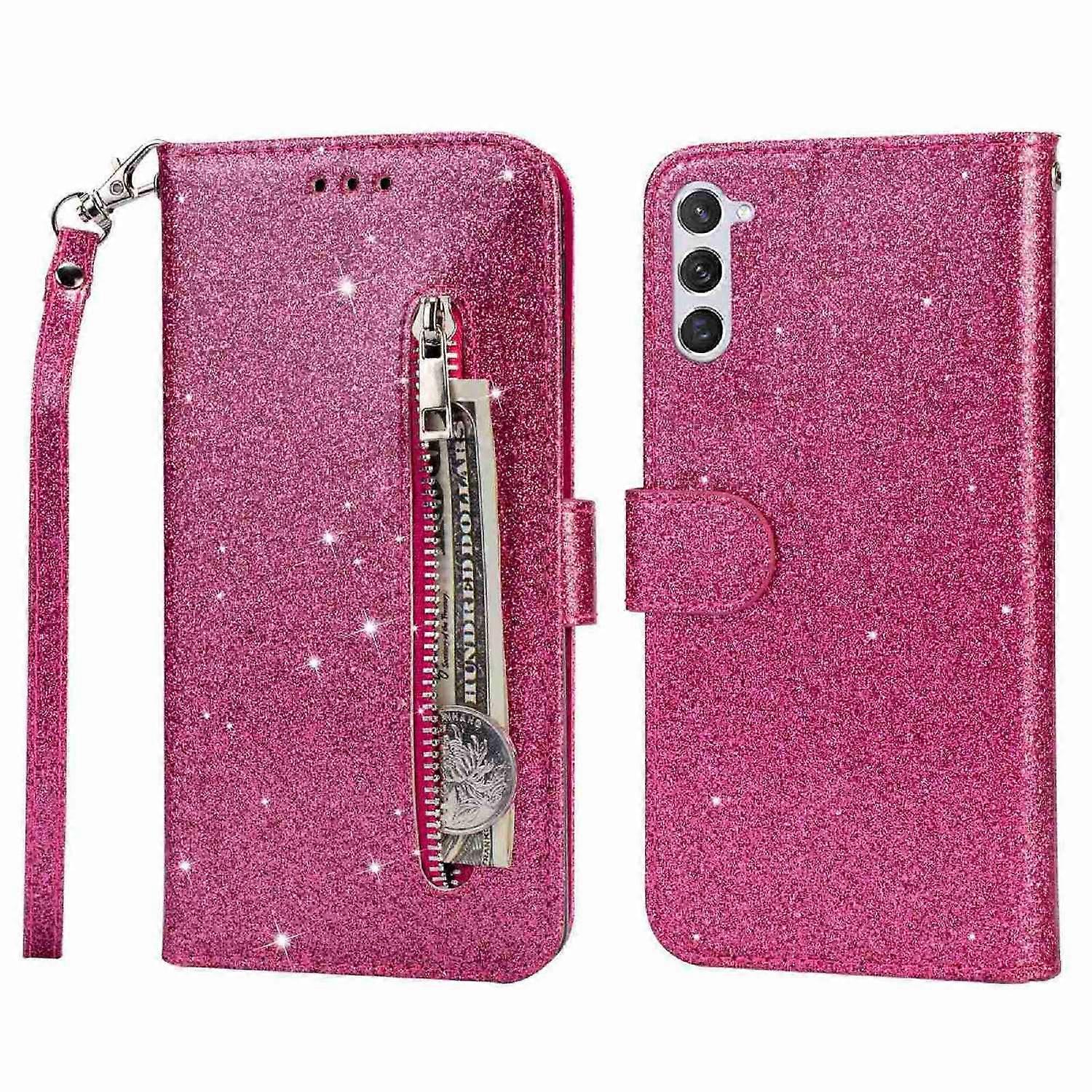 For Samsung Galaxy S23 Zipper Pocket Glittery PU Leather Anti-drop Phone Case Flip Wallet Stand Full