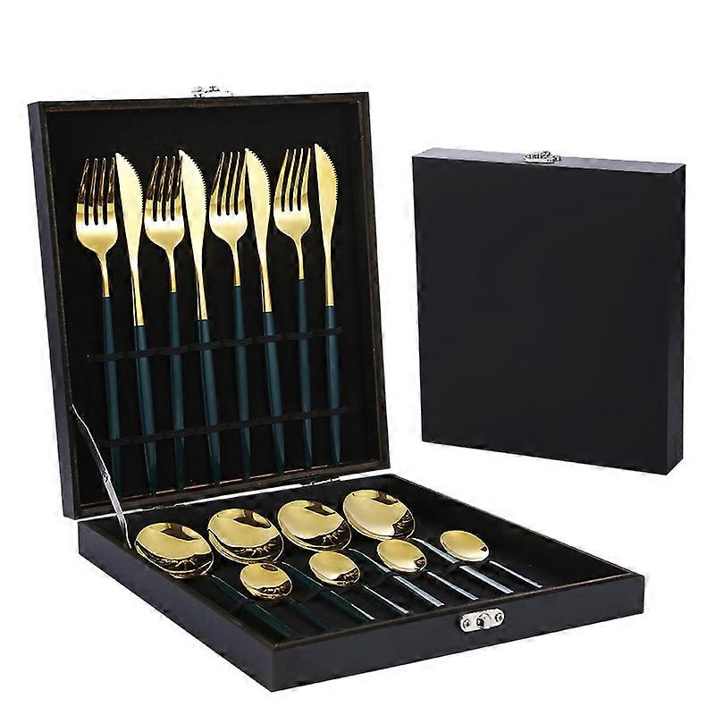 Green and 16-Piece Set (Black Box) E-commerce Sourcing Product Stainless Steel Cutlery 16-Piece Set Wooden Box Gift Box Black and Portuguese Knife,