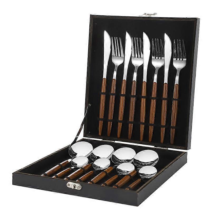 Silver pointed handle 16-piece set - black box wood grain clamp handle Japanese stainless steel knife, fork and spoon Western tableware set 16-piece