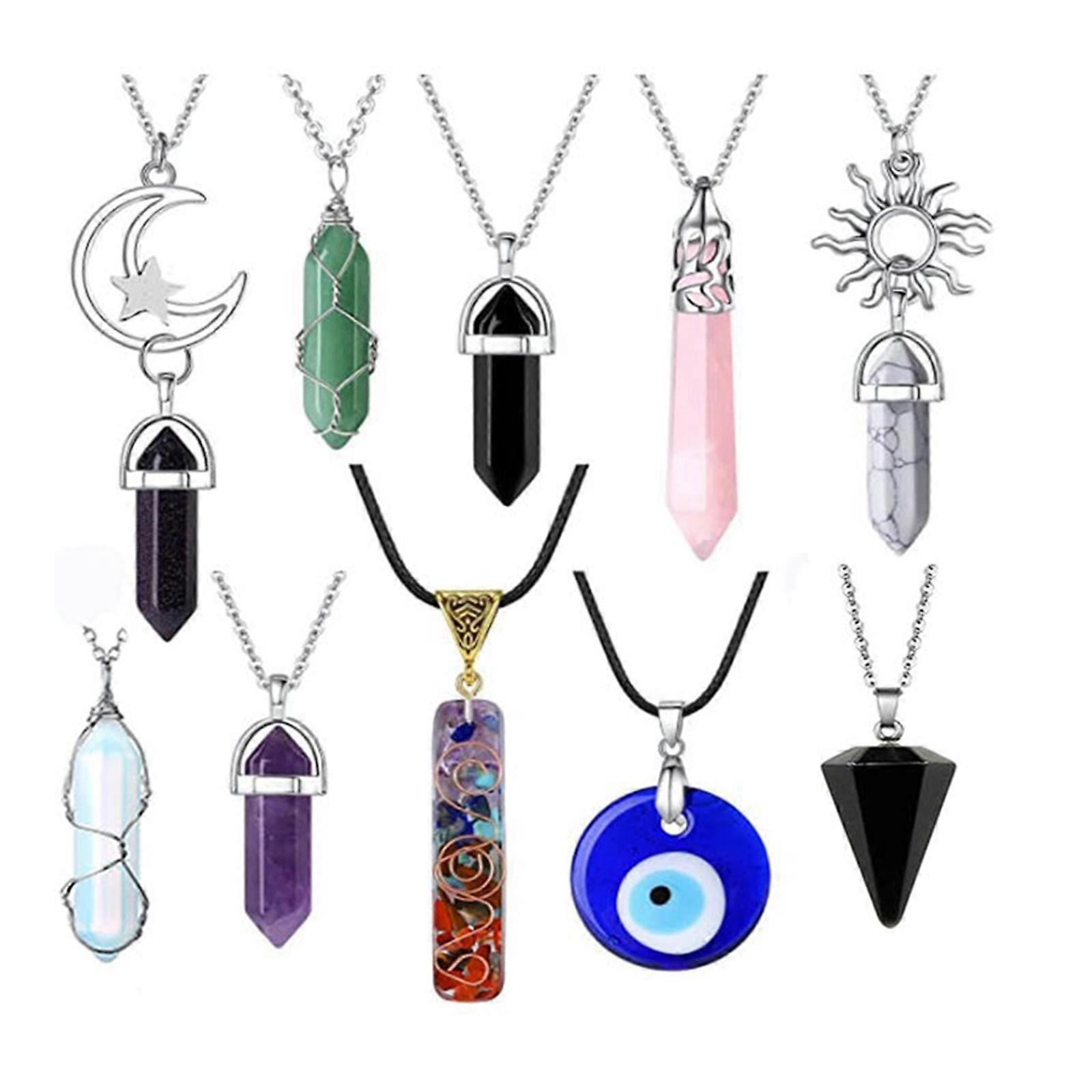 Set 10PCS Evil Eye Natural Stone Crystal Hexagonal Column Bullet Pendant Wrapped Silk Necklace Set