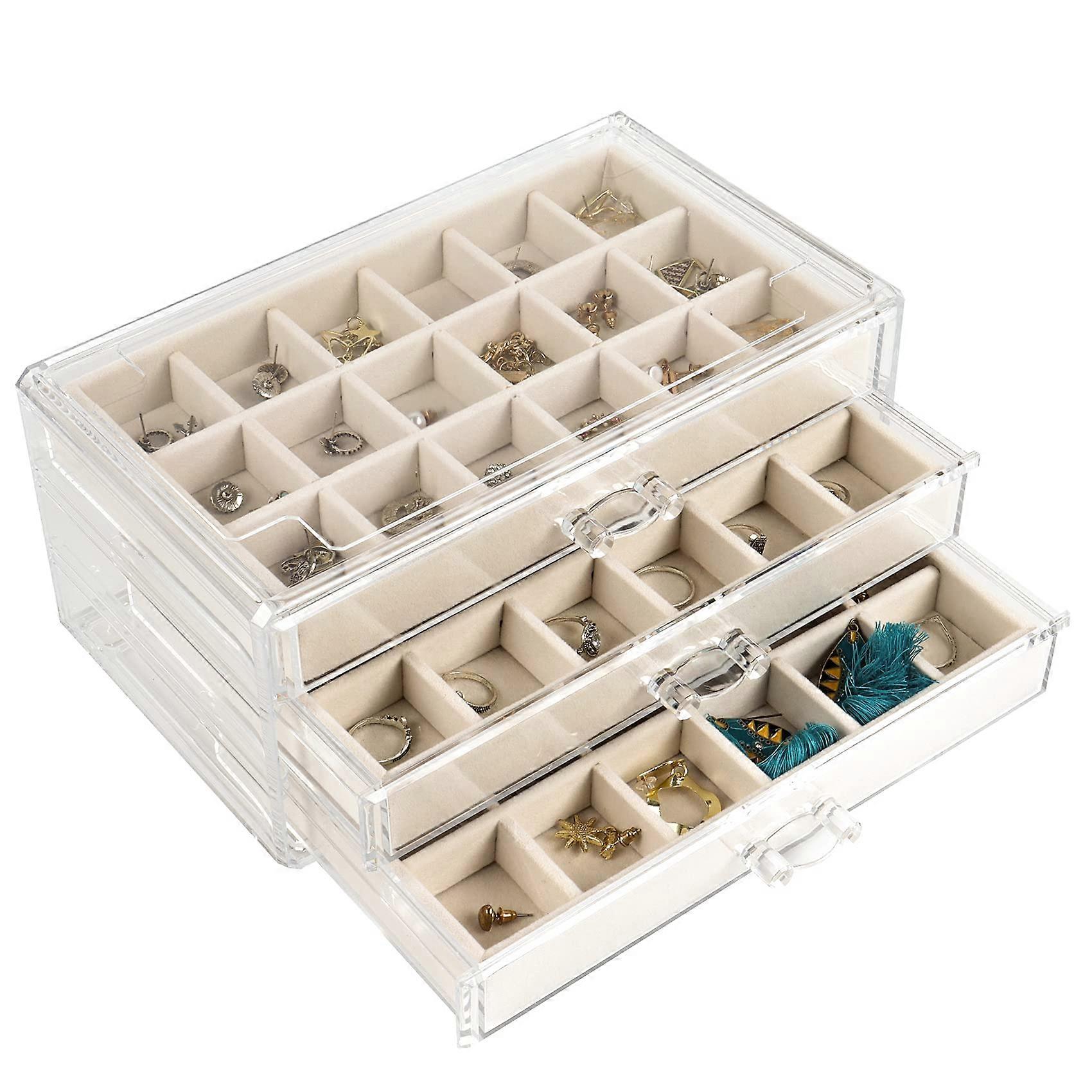 ZENGO Clear Acrylic Jewellery Box Jewellery Organiser with 3 Drawers for Women Jewelry Storage Box for Rings Earrings Necklaces Beige