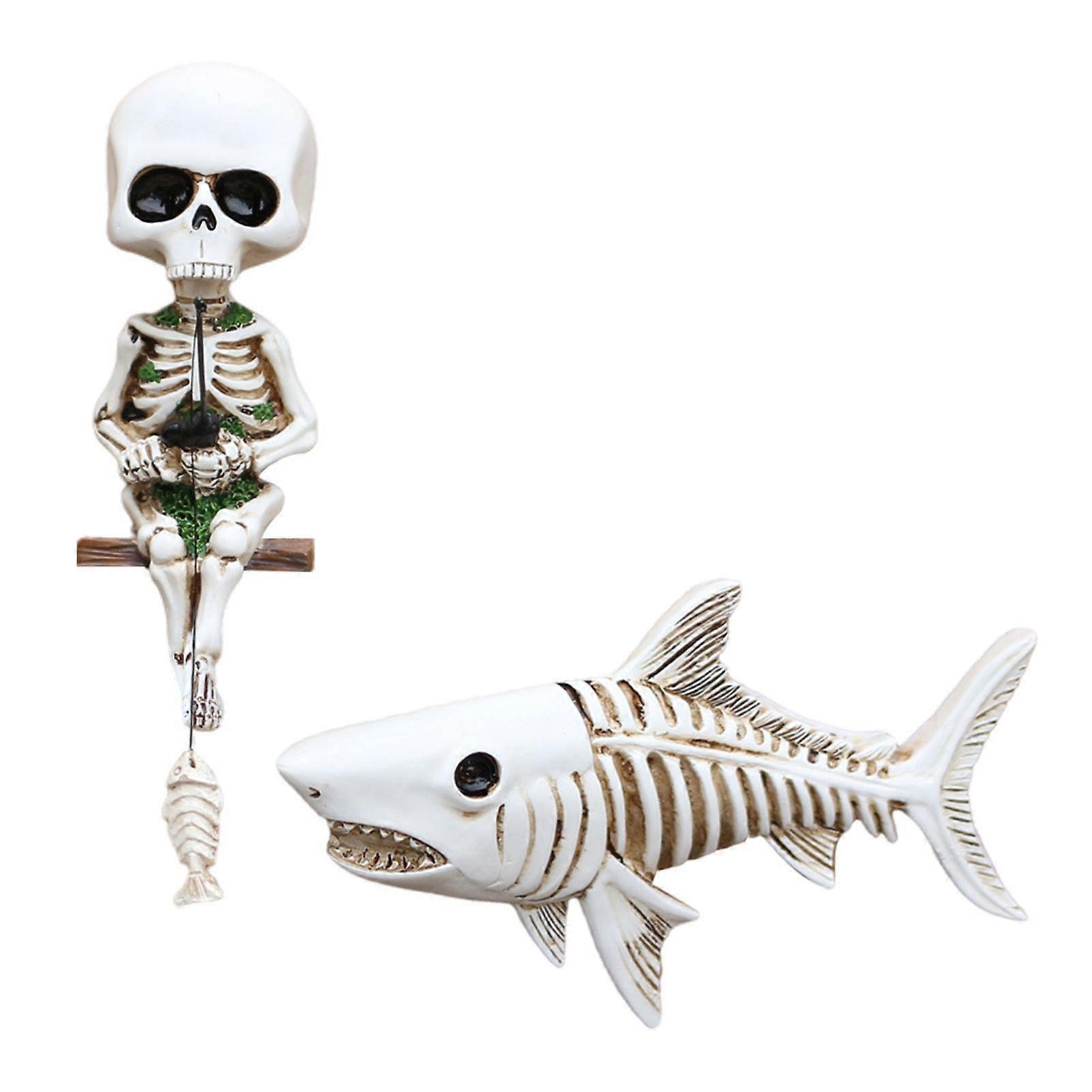 Unique Wall or Tank Display: Crafted from Synthetic Resin, this Skeleton Statue offers versatile placement options. Hang it on a wall or place it in a fish tank to elevate various home layouts effortlessly. Multi-Scene Versatility: Embrace the Halloween vibe with this artifact, create a creative fish tank landscape, add a dark touch to your study, or enhance your living room's theme with this versatile decoration piece. Darkly Humorous Design: Featuring a skeleton man fishing for a skeleton shark, this statue cleverly blends thriller and humor. Instantly captivate attention and become the visual centerpiece of any wall with its unique and fun design. Exquisite Craftsmanship: The intricate hand-carved texture and realistic shark shape showcase detailed craftsmanship. The retro and aged texture adds a touch of sophistication, elevating the overall aesthetic appeal. Festive Atmosphere Enhancer: Perfect for Halloween and Gothic themed parties, this Skeleton Statue is a must-have decoration. Infuse your space with a weird yet intriguing ambiance that sparks conversations and adds an element of fun to any gathering. Item Name: Skeleton Statue Material: Synthetic Resin Features: Gothic Style, Wall Decor, Spooky, Humorous Size Details: Skeleton Size: 3.9cm x 5cm x 10.9cm/1.54" x 1.97" x 4.29" (Approx.) Shark Size: 13cm x 3.4cm x 7.6cm/5.12" x 1.34" x 2.99" (Approx.) Notes: Due to the light and screen setting difference, the item's color may be slightly different from the pictures. Please allow slight dimension difference due to different manual measurement. Package Includes: 1 x Skeleton Man Statue 1 x Shark Statue