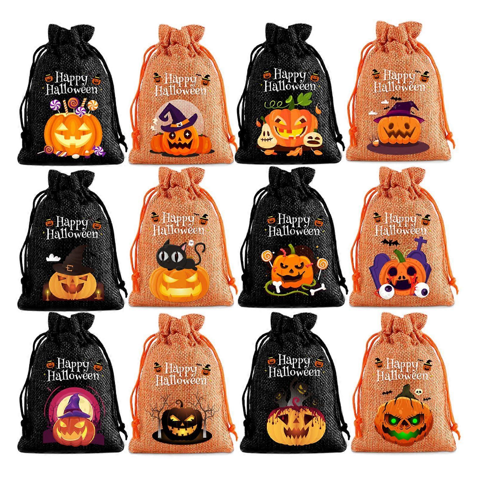 Jikaixiang 12 Pcs Halloween Treat Bags Burlap Gift Bags Mini Drawstring Candy Bags Pumpkin Pattern Goodie Bags for Halloween Party Favors
