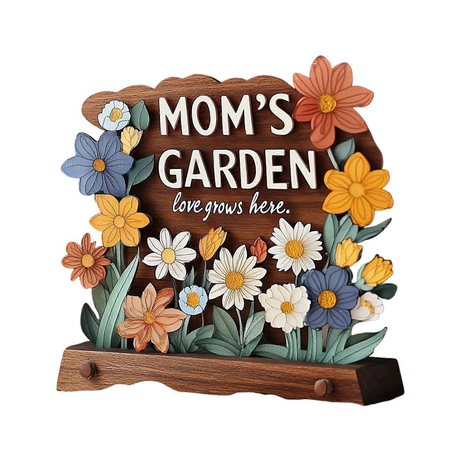 Jikaixiang Mom's Garden Ornament Love Grows Here Sign with Wooden Base Table Centerpiece Decoration Mother's Day Birthday Appreciation Gifts