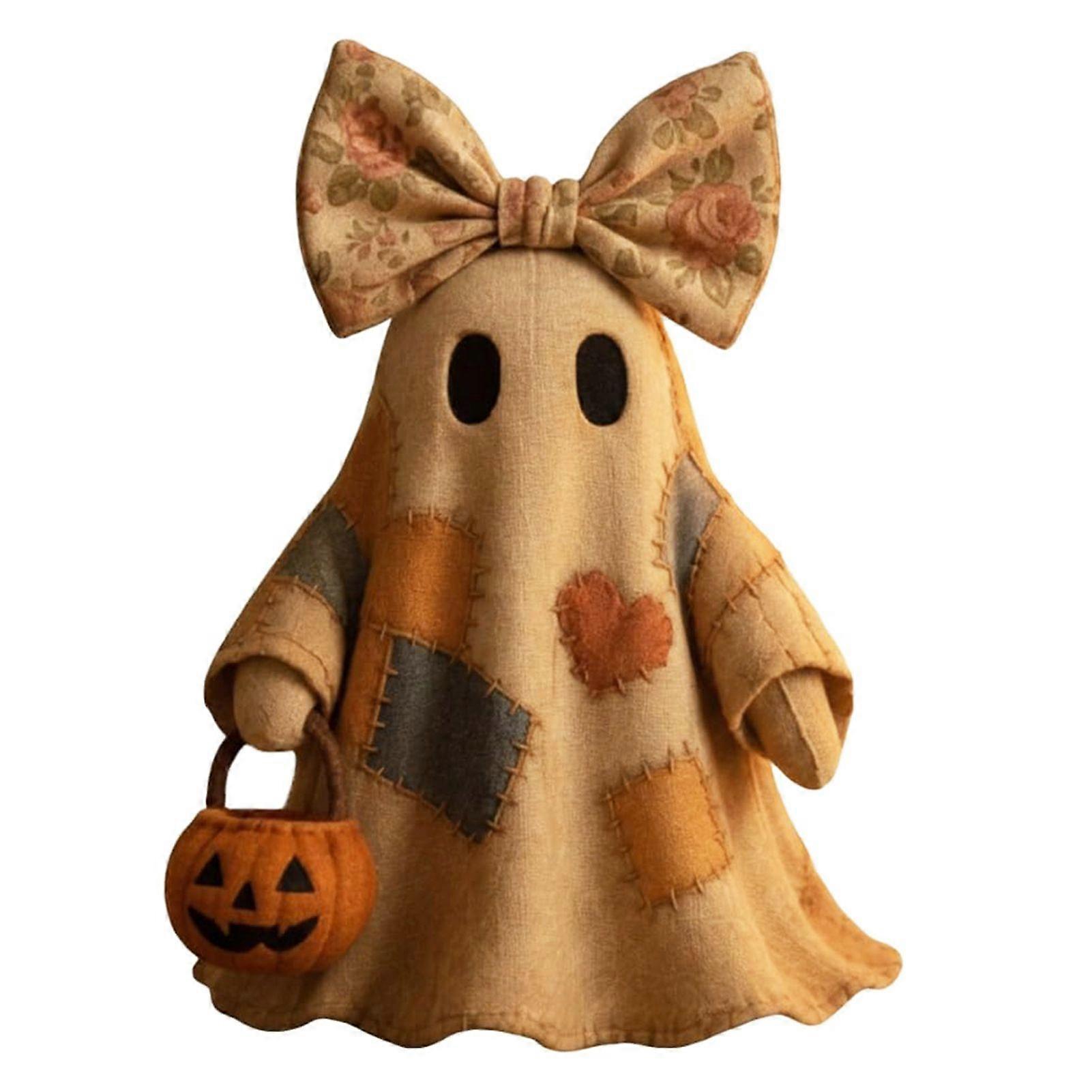 Jikaixiang Patchwork Ghost Halloween Decor Handmade Ghost with Pumpkin Bucket And Floral Bow Vintage Tabletop Ornament for Shelf Home Decoration