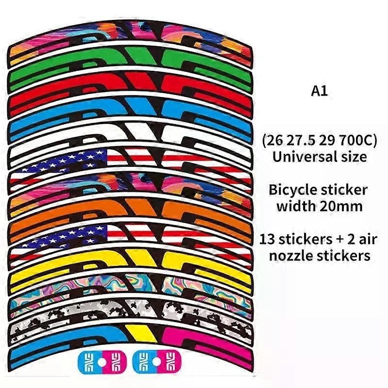 Specifications High-concerned chemical:None Material:PVC Type:Stickers Origin:Mainland China Process:Inkjet craft on a black background sticker width:about 20mm Applicable size:26 27.5 29 700C Universal size Function:decorative wheels Features 1:waterproof and sunscreen Features 2:No residual glue left after tearing off 1. One order contains 13 stickers, 2 air nozzle stickers, can glue the four sides of the two wheels of the bicycle 2. Applicable size:26 27.5 29 700C Universal size 3. Sticker width: about 20mm (If other widths are required, please contact us) 4.The background of this sticker is black inkjet craft 5.This sticker uses a special film, waterproof, sunscreen, anti-corrosion 6.Use special glue for car stickers, tear off without leaving glue residue Notice: 1.Before pasting, be sure to wash and dry the paste surface 2.Matte surfaces may not adhere well. It needs to be used with an adhesion promoter to be effective. Contact us if you need an adhesion promoter 3.There may be slight color difference between the sticker and the picture. Friends who mind, please place an order carefully. 1. After receiving the item, please contact us if you have any questions 2. If you place a large order, please contact us, we will provide some discount 3.There may be slight errors in the size, please understand