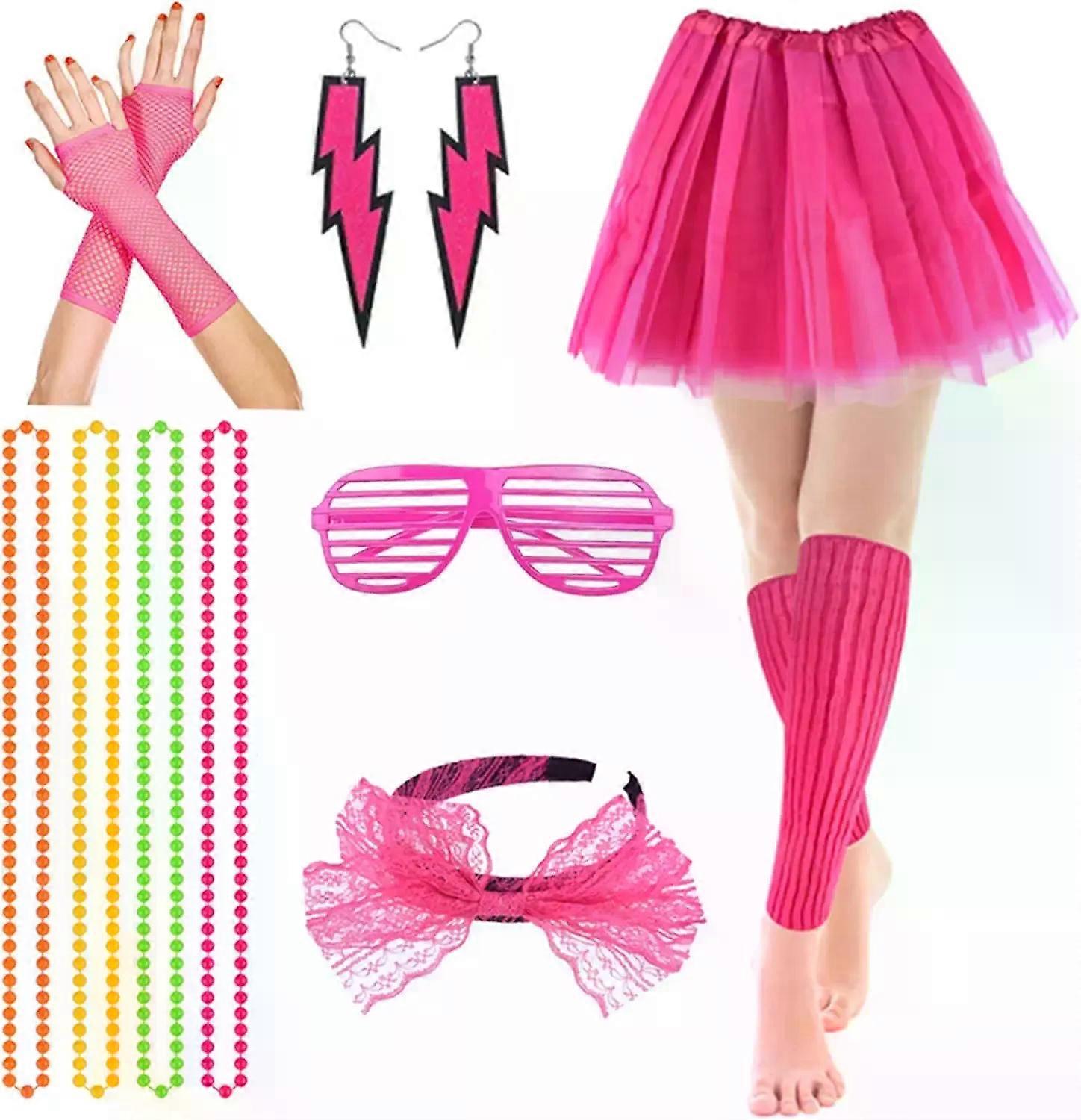 Tutu Leg Warmers Fishnet Pink Gloves Neon Necklaces Bead 80s Lace Bow Headband Lighting Earrings Sunglasses 1980s Fancy Party