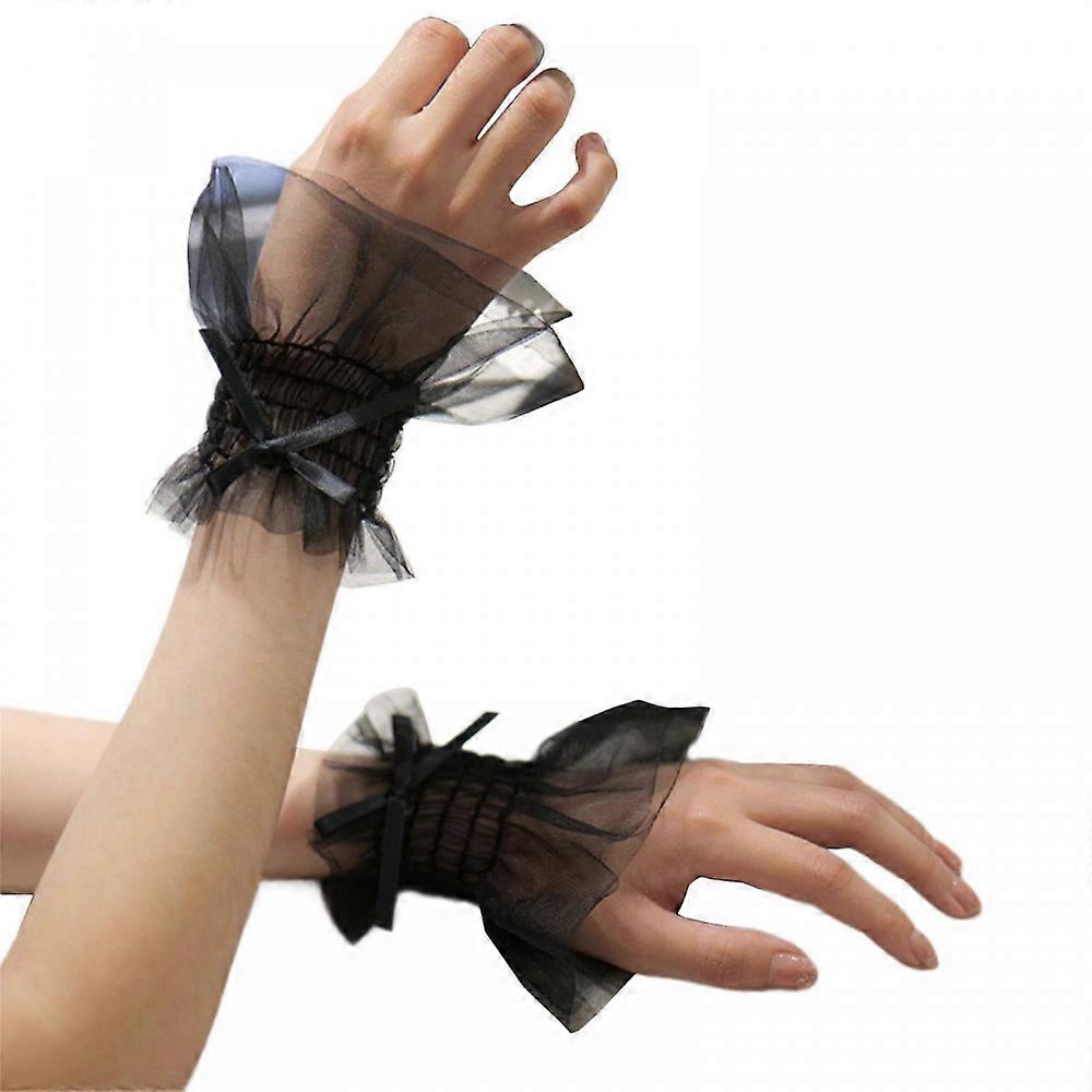 Fairy Wrist Cuffs Detachable Elegant Wristband Flared Tulle Ruffled False Bowknot Cuffs Sweater Wristband Black
