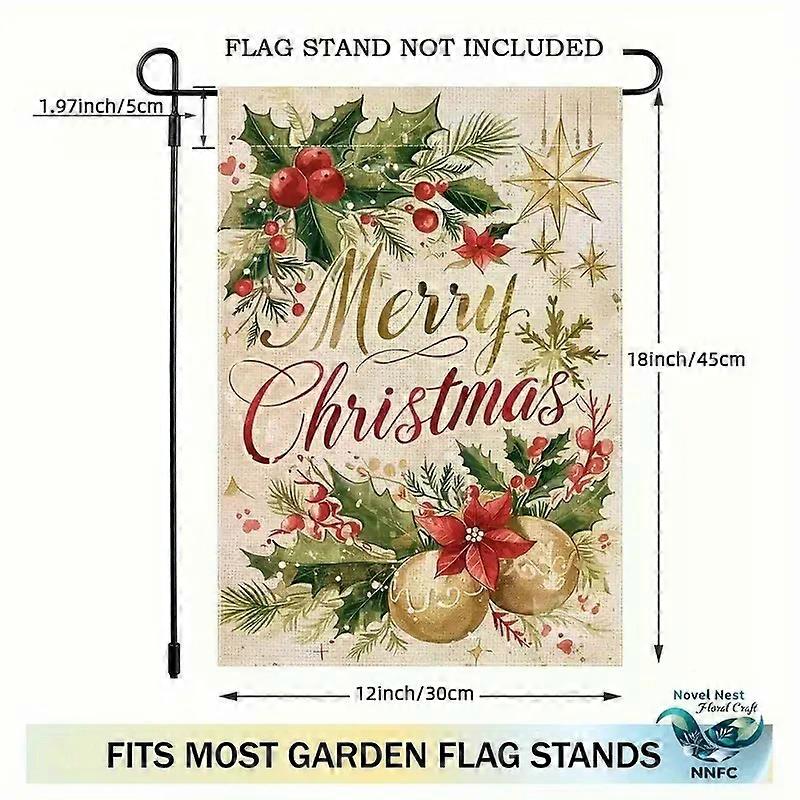1pc Dual Sided Linen Blend Garden Flag "Merry Christmas Happy Holidays" with Holly Berries, Poinsettias Snowflakes Design