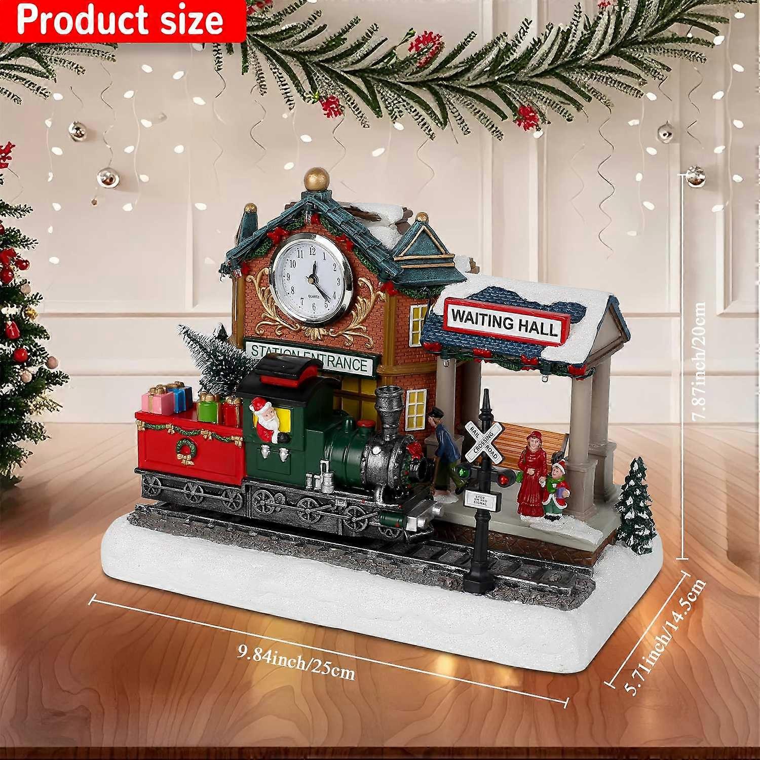 Animated Christmas Village Scene with Moving Train and Clock LED Lights Music & Train Station Holiday Building Indoor Decoration