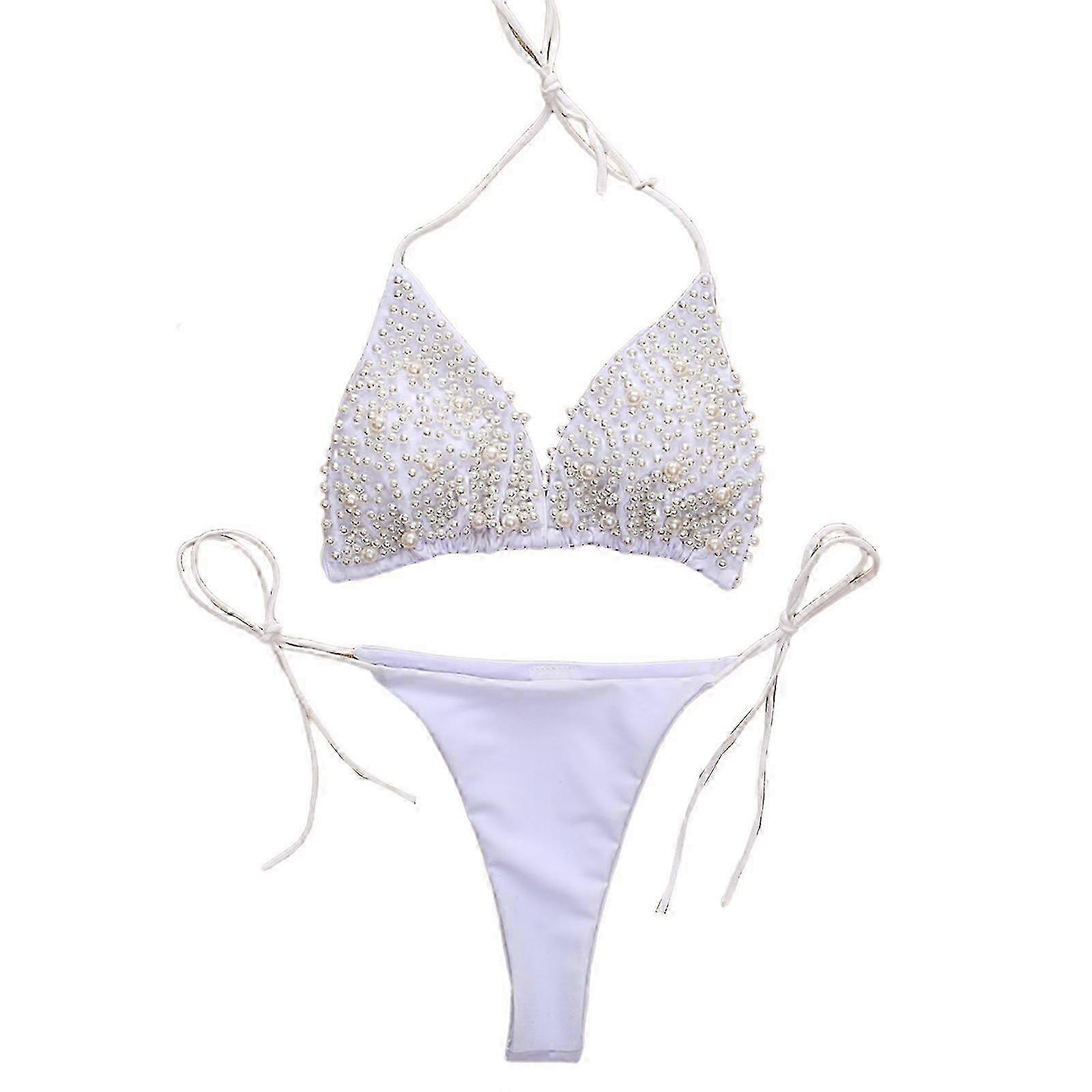 Sexy Tie Side Triangle-Bikinis Set for Women-Halter Swimwear-Two Pieces Swimsuit Sparkly Pearls Bathing Suit Beachwear Silver M