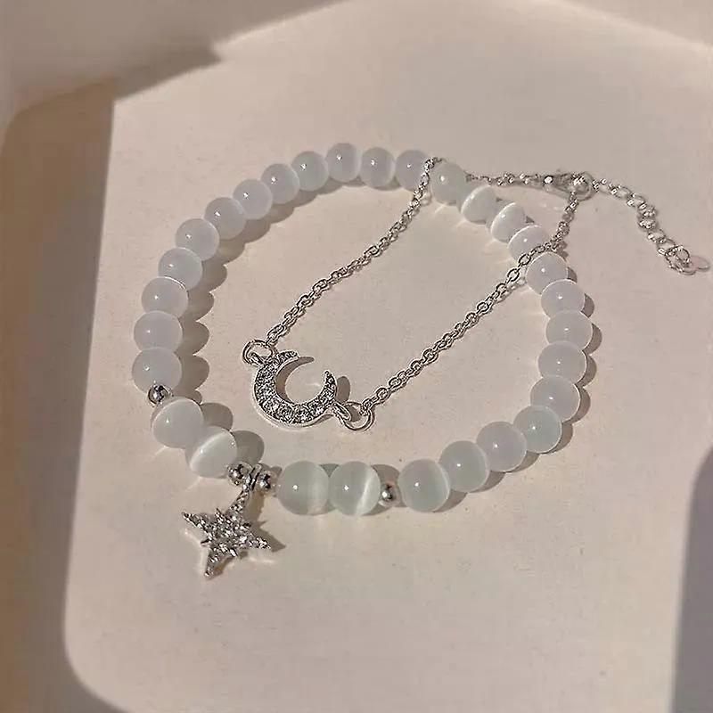 2Pcs Fashion Crystal Opal Beads Bracelet For Women Girls Silver Color Star Moon Chain Pendant Charm Bracelets Jewelry Gift