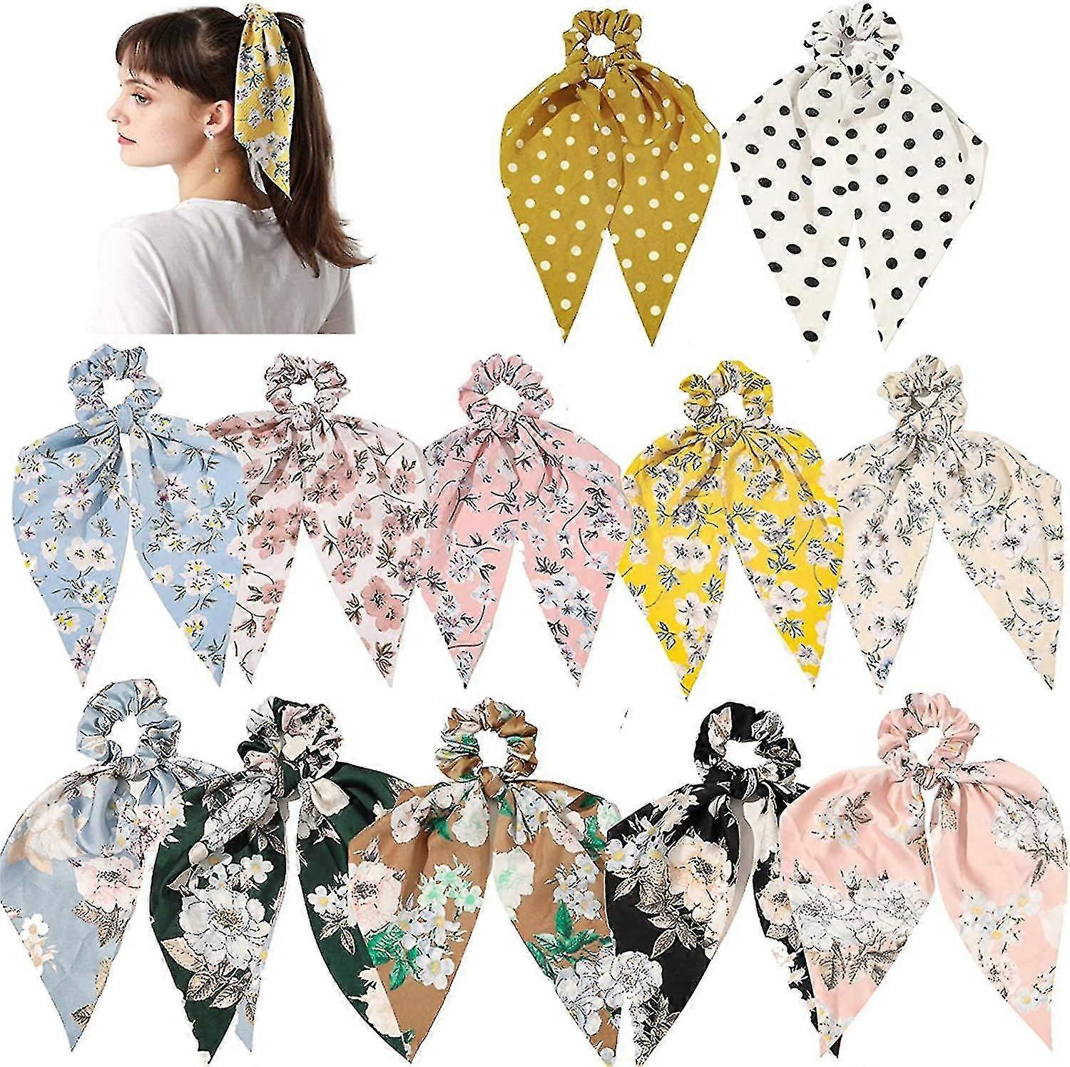 Chiffon Bowknot Hair Scrunchies with Silk Long Scarf Bow Hair Bands, 12 Pcs Elastic Gift for Styling Hair