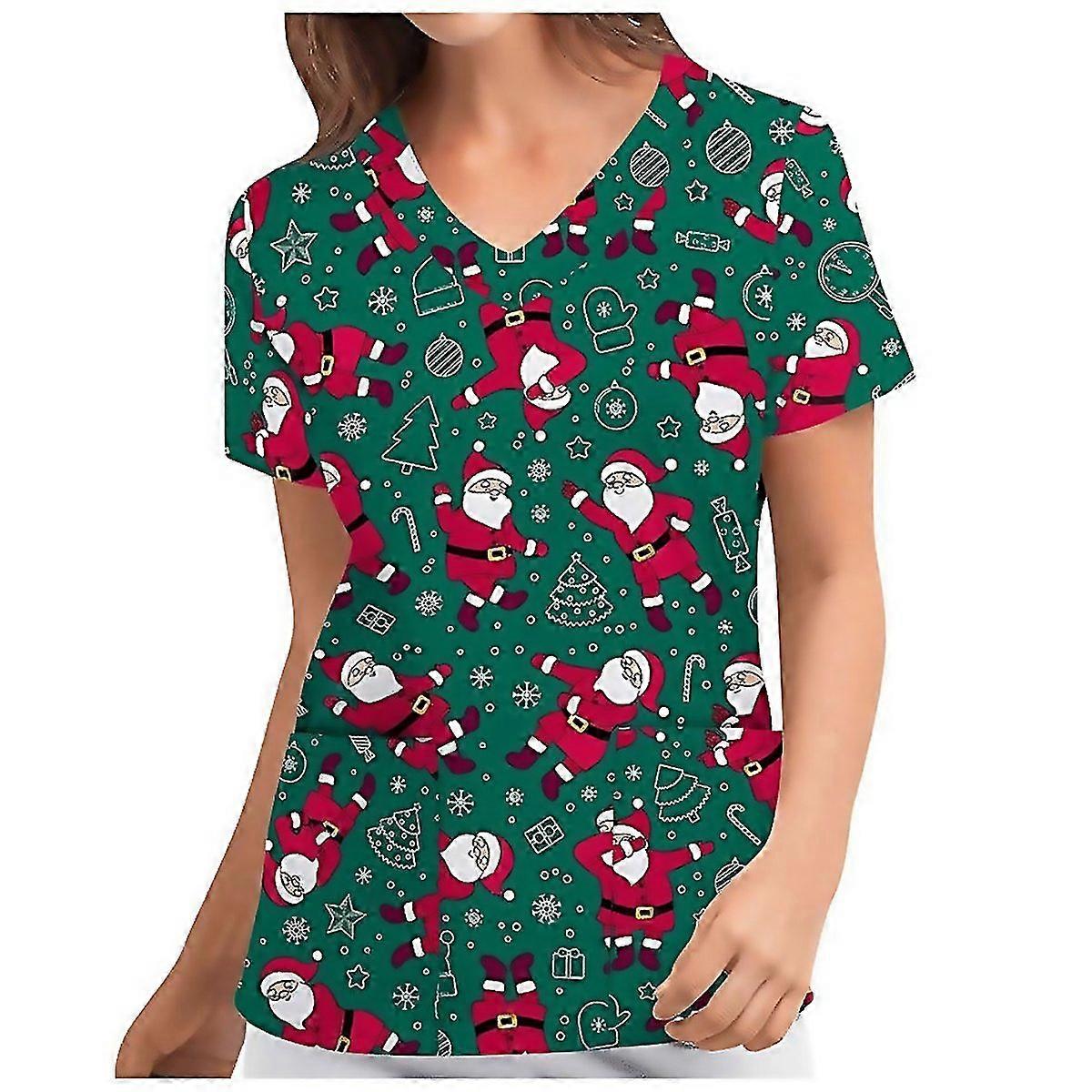 For Womens Short Sleeve Tshirt Christmas Printed Uniform Nursing Scrub Pocket