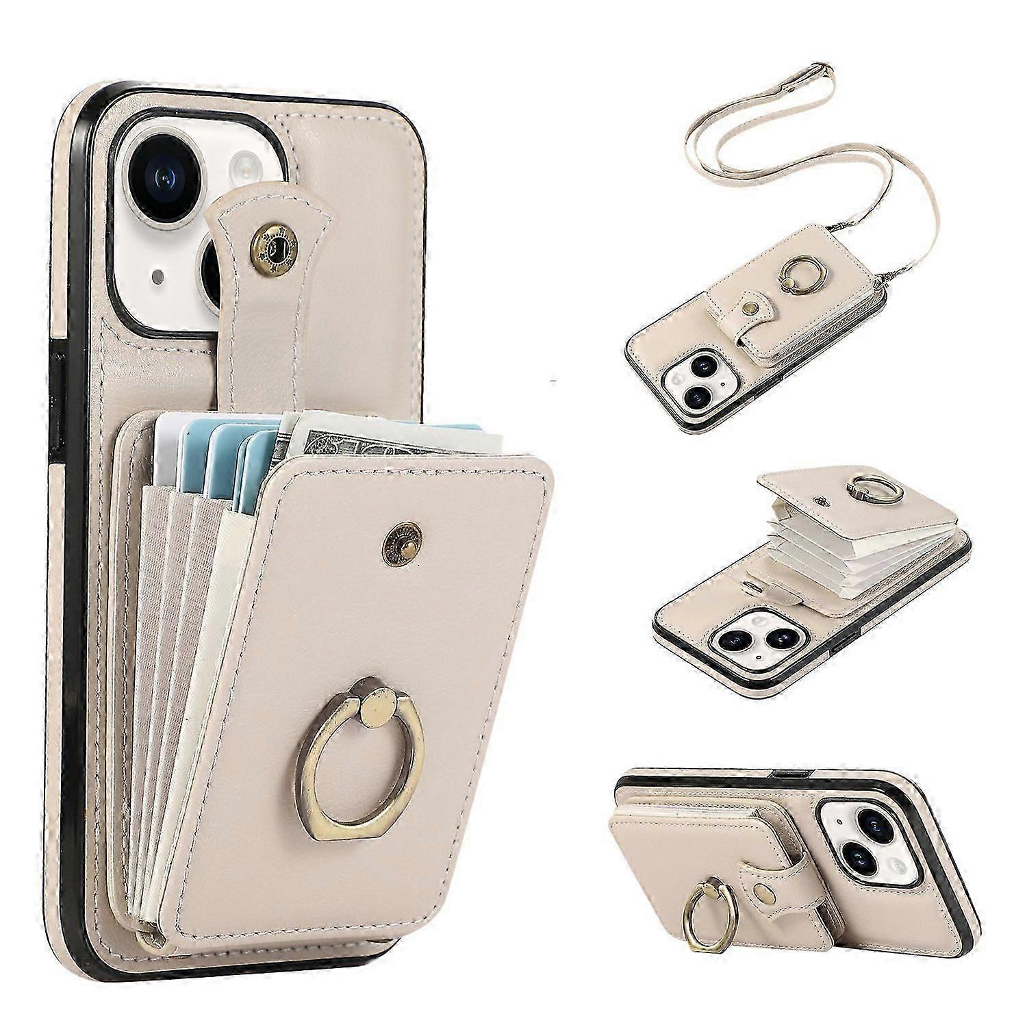 For iPhone 15 Case Card Holder Ring Kickstand TPU+PU Leather Phone Cover with Long Strap jkw