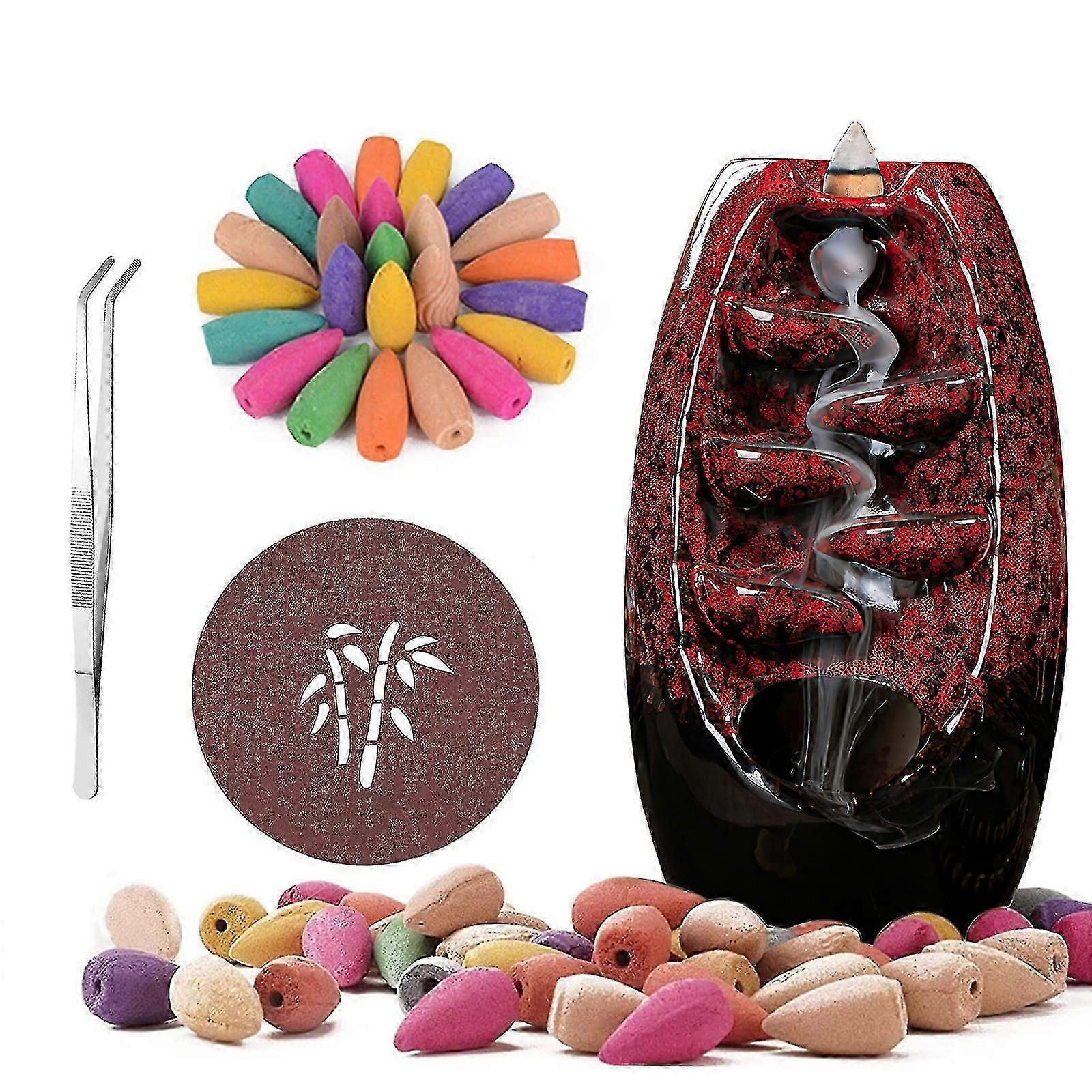 Ceramic Reflux Incense Burner with 100 Cones, Waterfall Aromatherapy Holder in Red for UK Homes