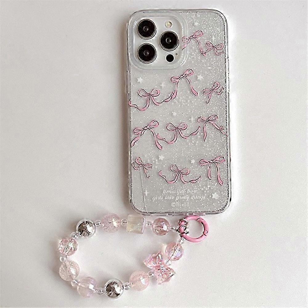 Premium iPhone 14 Pro Compatible TPU Case with IMD Bowknot Glitter Design and Beaded Strap Phone Cover